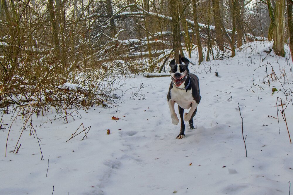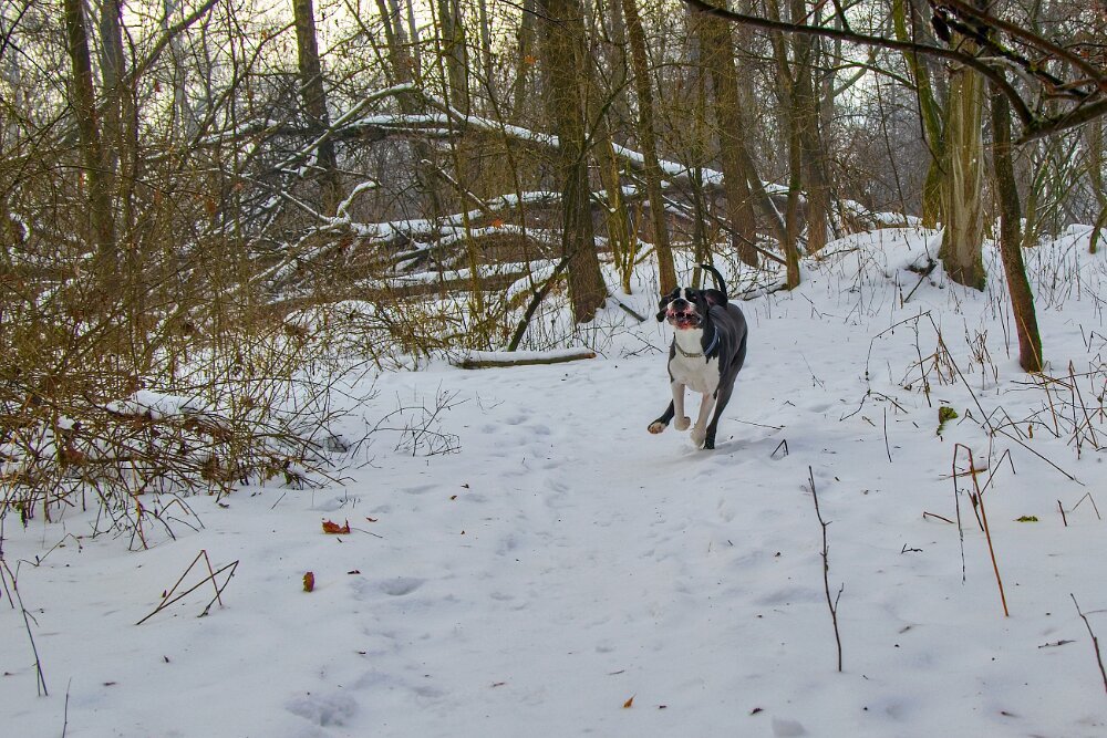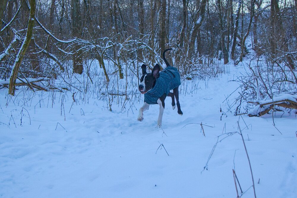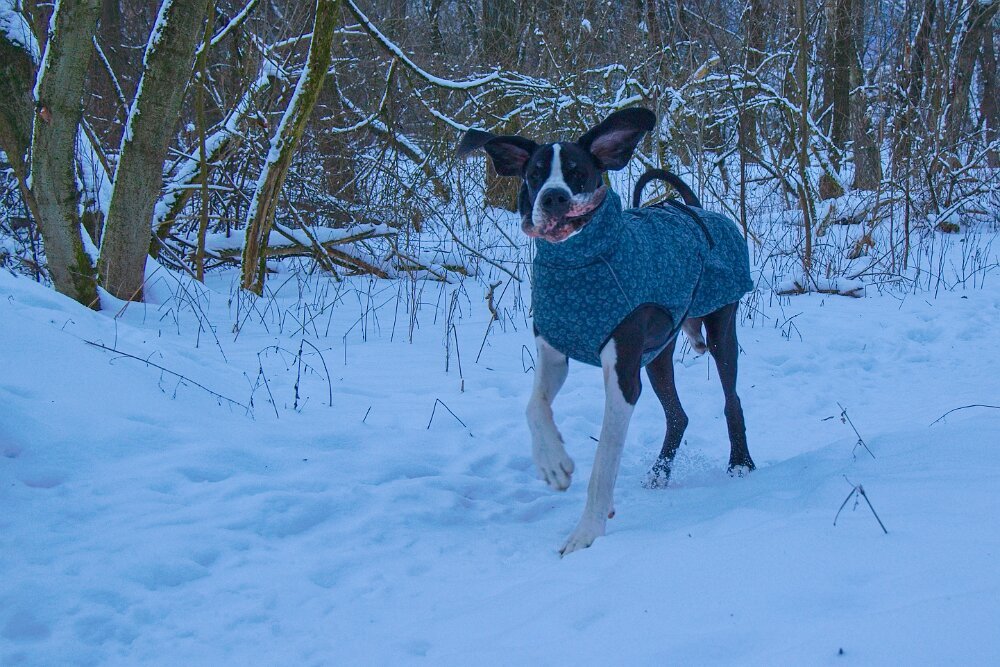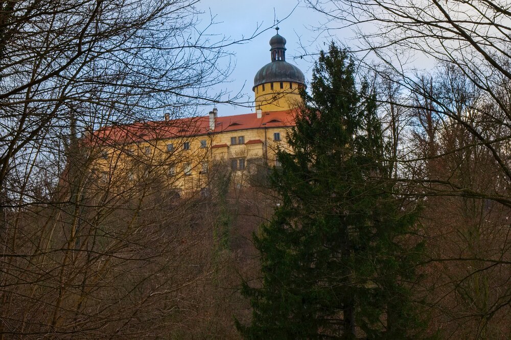 Yoda mě dneska nejprve dělal radost - v civilizaci kolem hradu chodil perfektně, pak ustál hezky setkání s kopytníky, v pohodě v lese šel na volno a reagoval na každý pokyn… a pak mě vytočil, jako už dlouho ne - dvakrát po sobě vyrazil za pohybem (auta daleko maličká na obzoru prosvítající mezi stromy). To už neudělal hodně dlouho. Sice to vždy na zařvání otočil - ani zdaleka se k silnici nepřiblížil… auto ho ani nemohlo zaregistrovat… ale stejně bych ho zabila. Hlavně jsem to nečekala a málem mi vyrval ruku z pantu. Takže pak měl “galeje”… střídali jsme chůzi u nohy s povelem stůj… Návrat do věku štěněcího. Jinak procházka z Grabštejna k “80 dubům” byla parádní - sněhu minimum (proto jsme tam jeli - u nás to je v lese ještě na delší chůzi blbý), vítr snesitelný a kromě srnek jsme nepotkali ani živáčka.