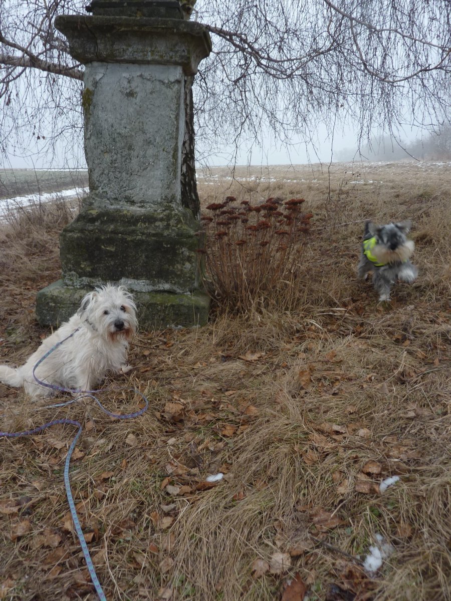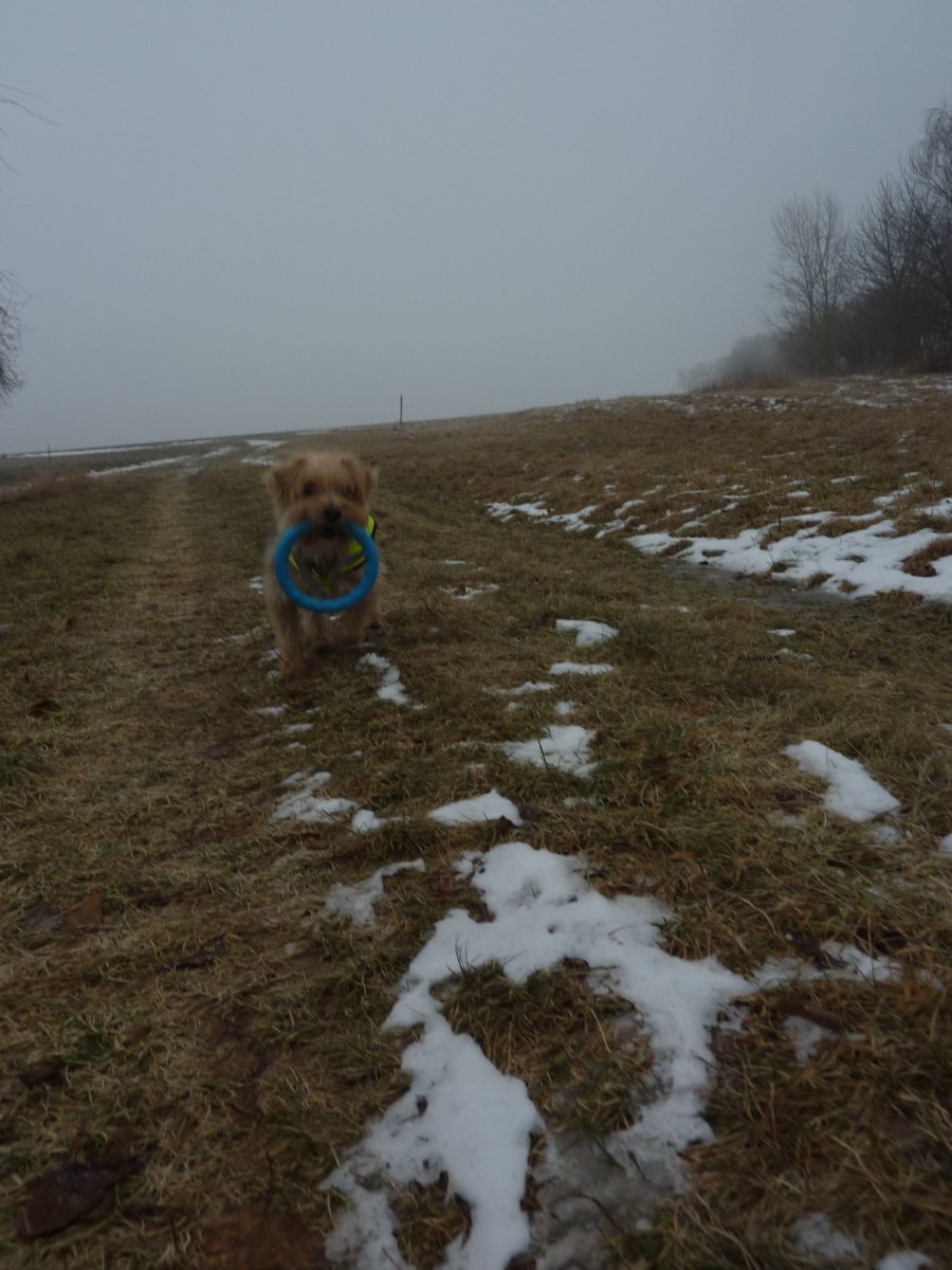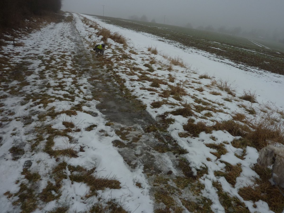 dnešní mlžná za humnama,ke křížku ze 3 psama a zpět,naše druhá nejkratší trasa,k lípě úplně ledovka,tady mezi polama,trávou to jde,zima jim asi nebyla,Žeryk válel sudy v trávě,poslední fotka je Dafinčin posez na křesle…