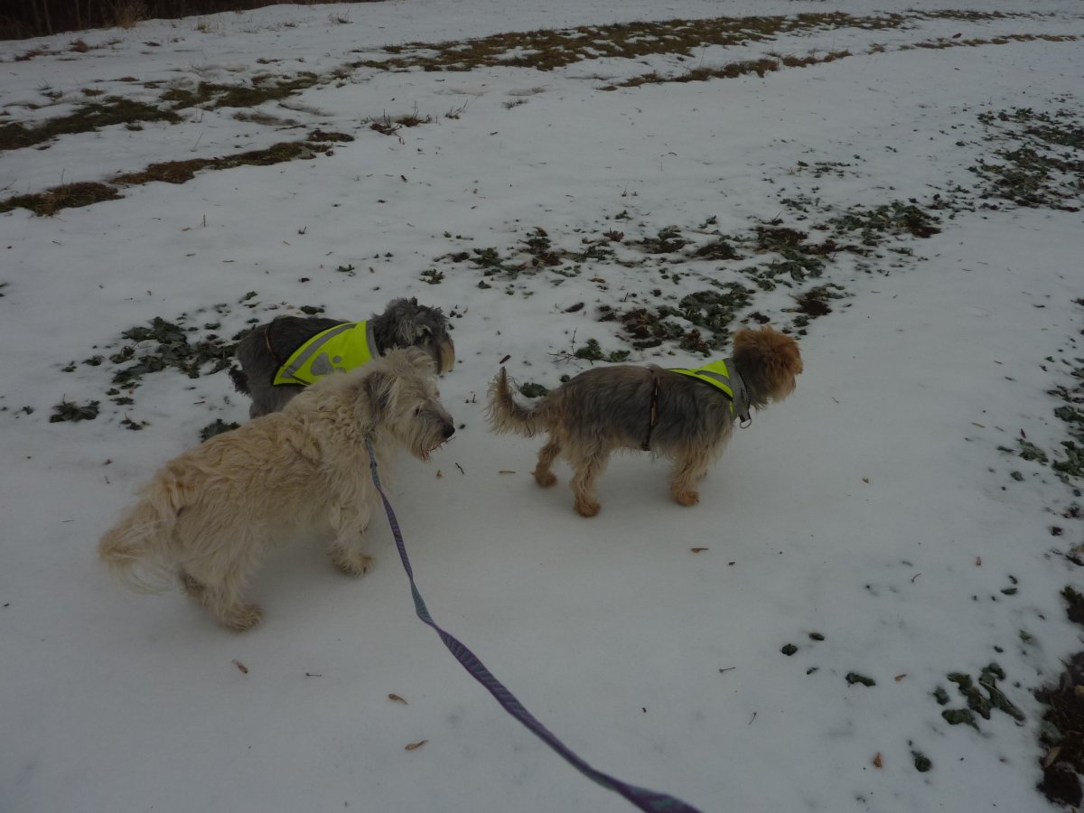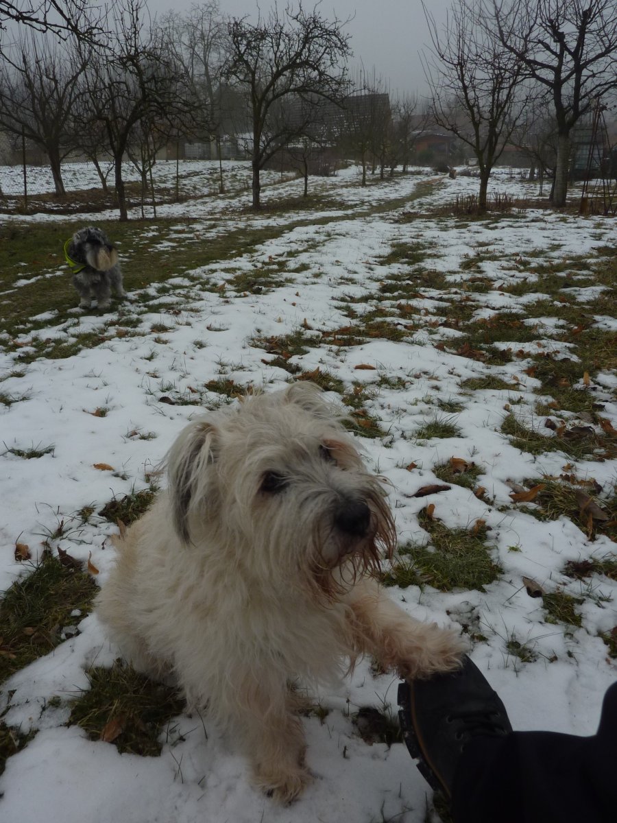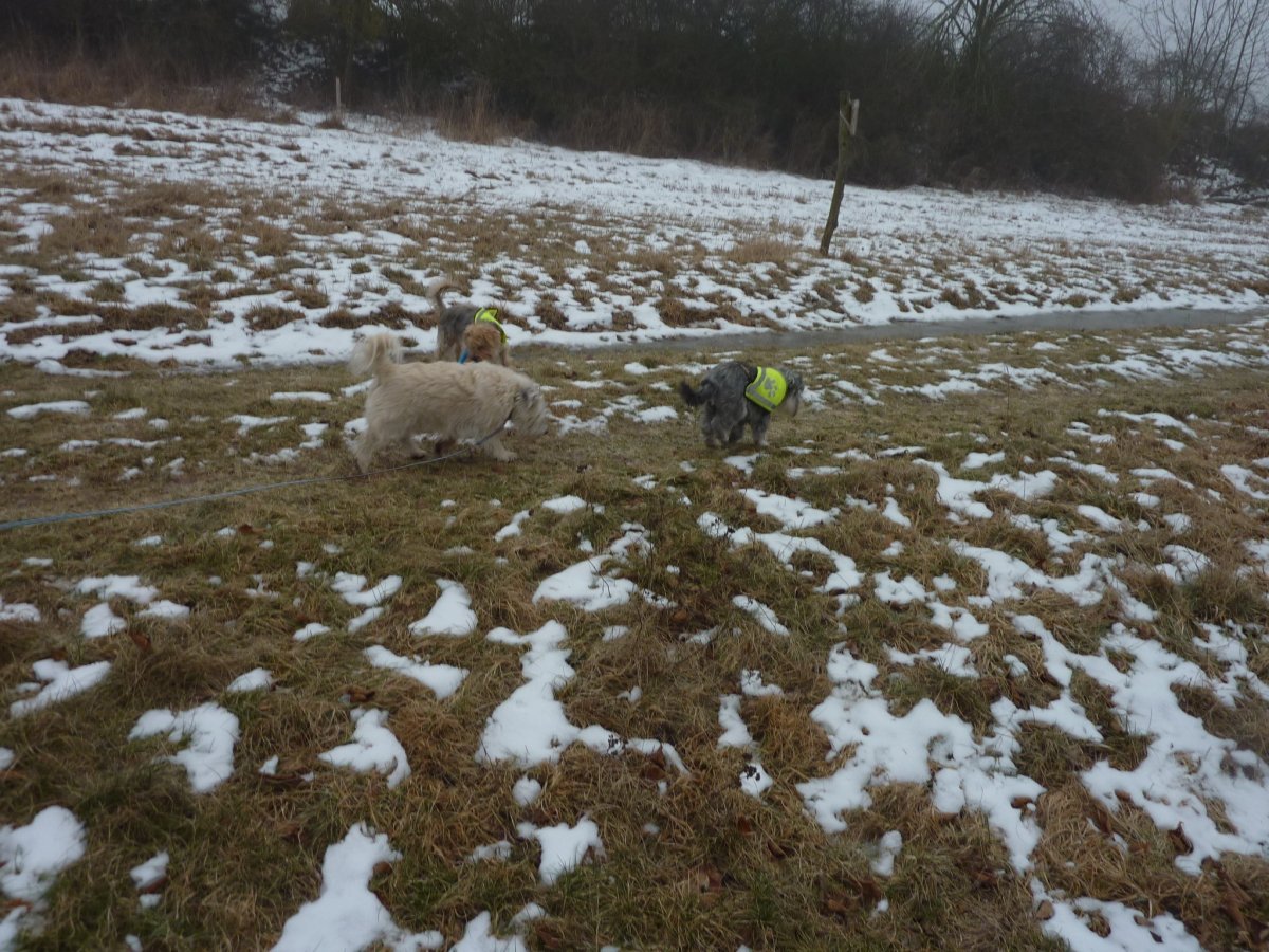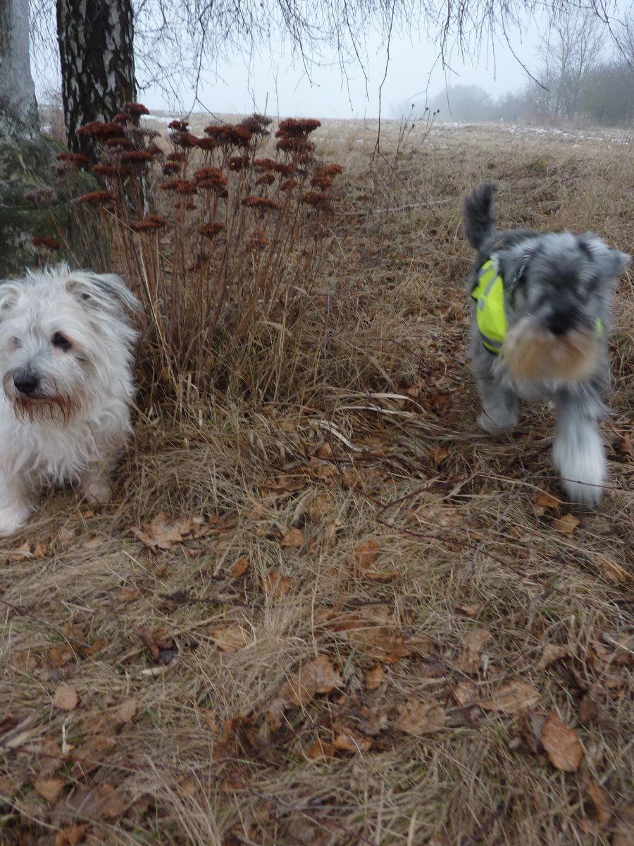dnešní mlžná za humnama,ke křížku ze 3 psama a zpět,naše druhá nejkratší trasa,k lípě úplně ledovka,tady mezi polama,trávou to jde,zima jim asi nebyla,Žeryk válel sudy v trávě,poslední fotka je Dafinčin posez na křesle…