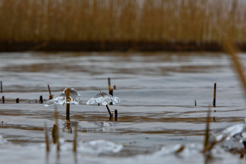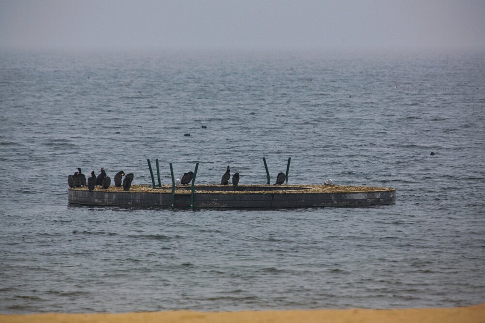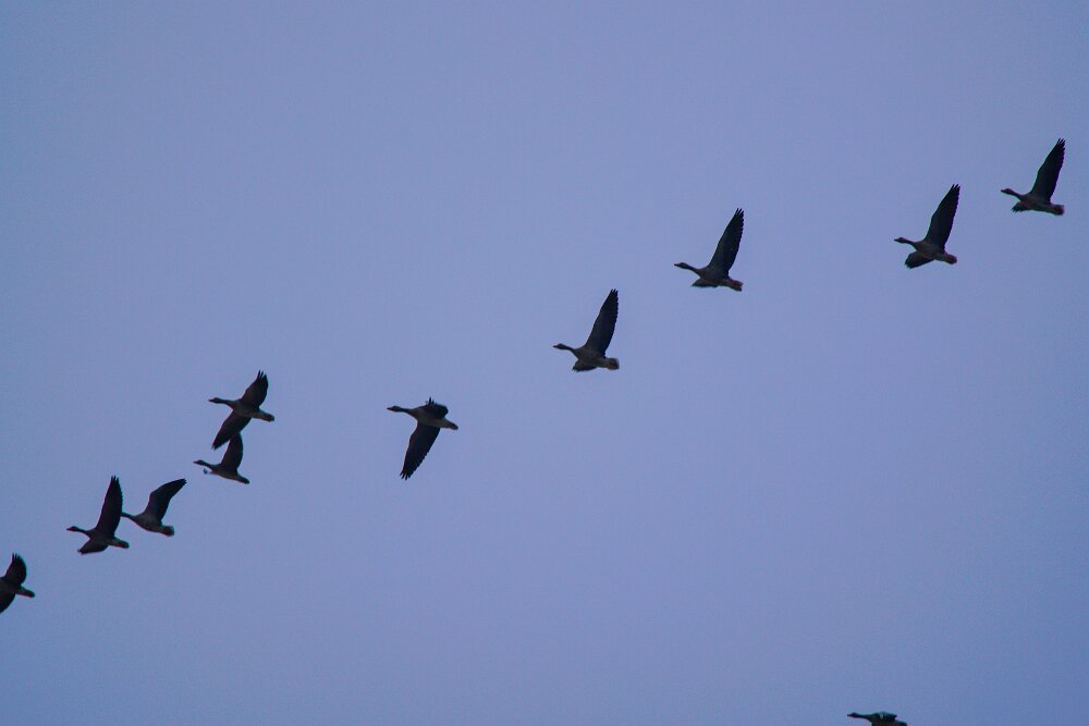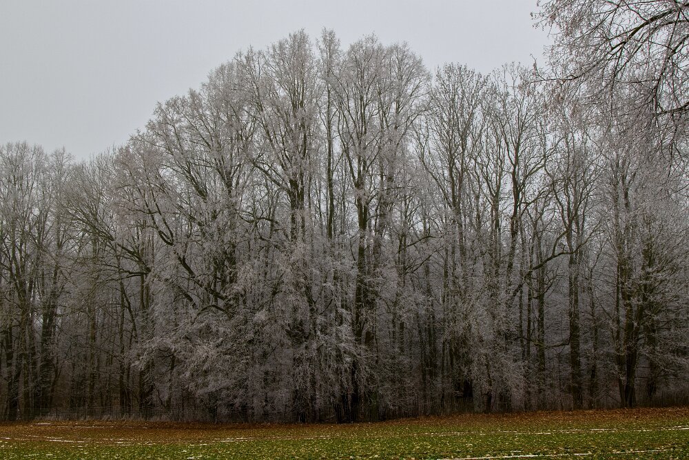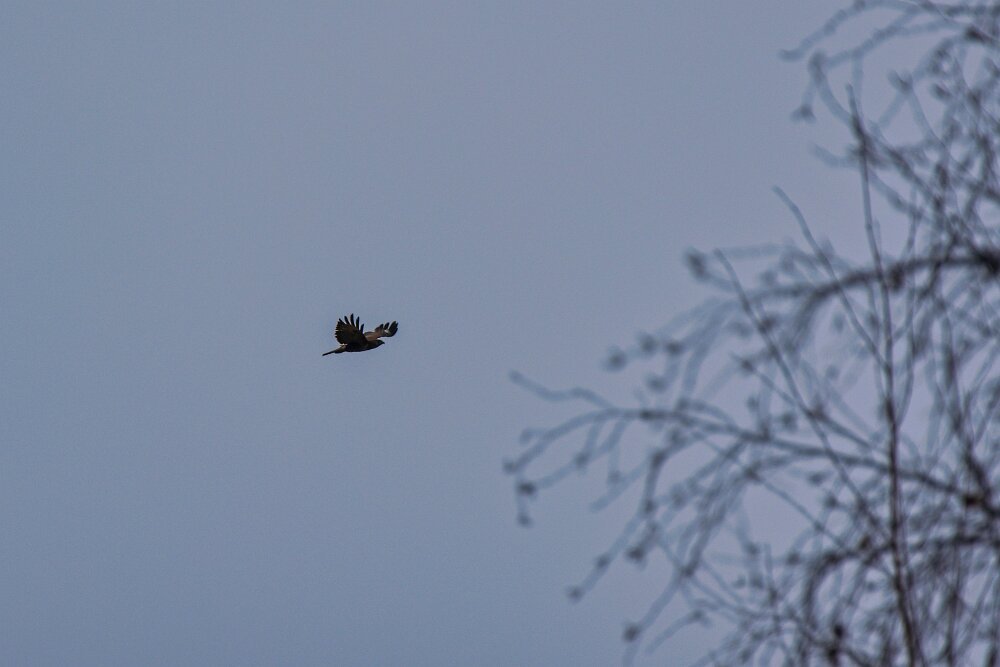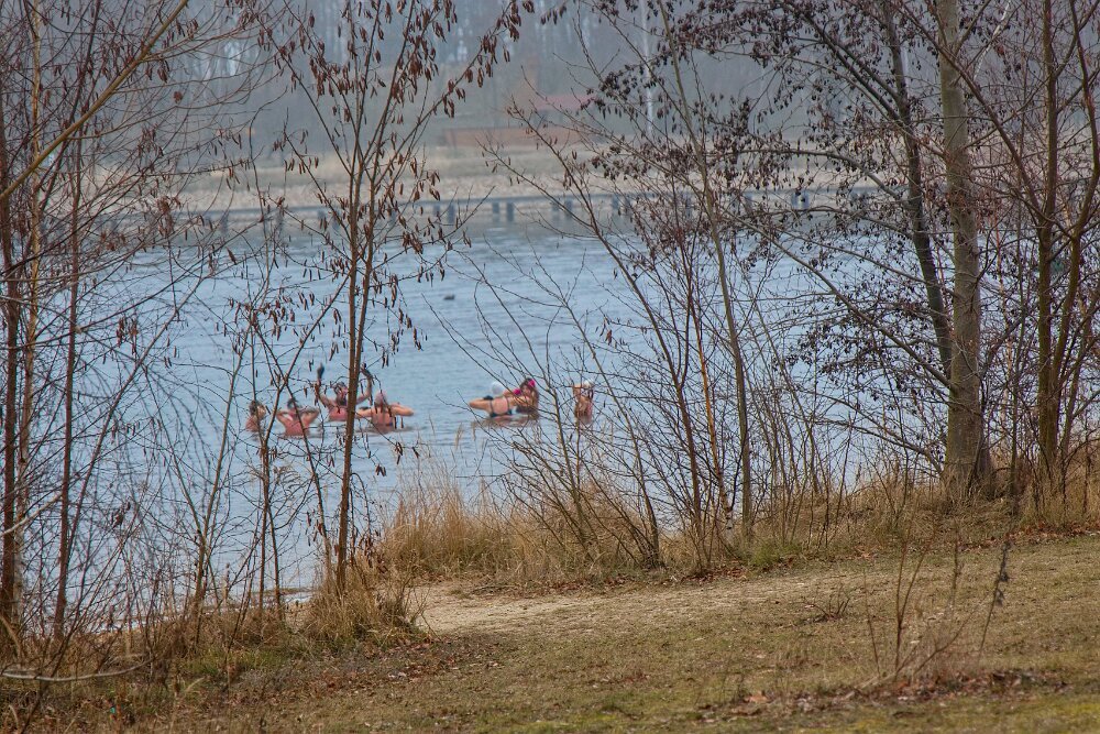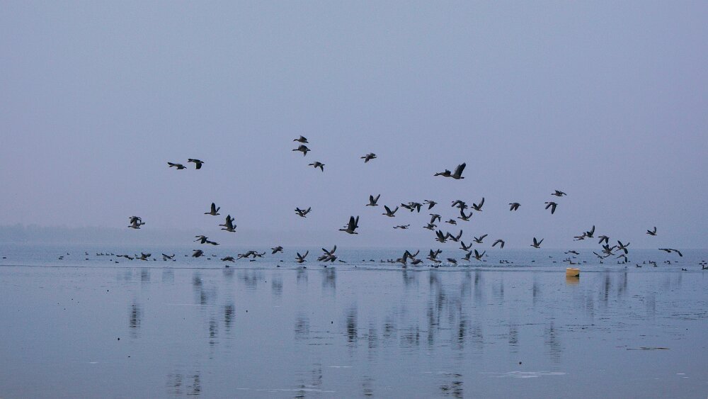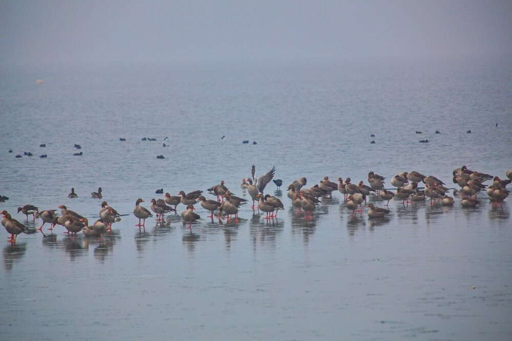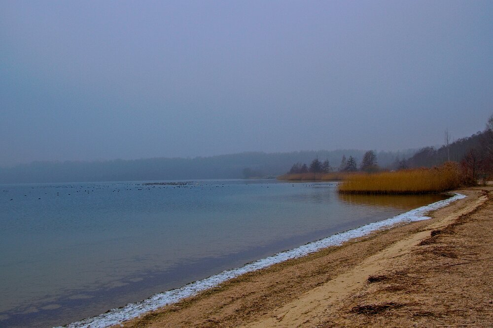 zato těch bezpsích je nějak moc. Dvě ze zamrzlého lesa za humny, zbytek z dneška. Berzdorfer see je zatopený důl - hloubka až přes 70 metrů, plocha 960 hektarů… jen tak nepromrzne, takže vodních ptáků spousta - kolem je zemědělský kraj, bezsněžné pole a louky, takže i pást se mají husy a jeřábi kde… Dojedeme tam asi za třičtvrtě hodinky. Mimochodem kolem “rybníka” byly i dnes v mlze a šedu otevřeny tři občerstvení (ale my si nesli řízek a kafe v ruksaku)