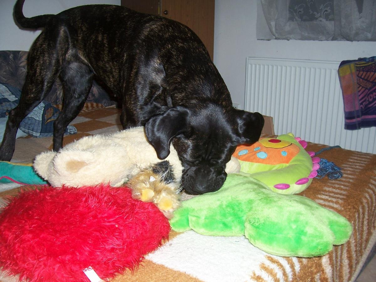Já plyšáky už taky ne, Cherry to žrala, hlavně tu výplň, a to je pak o nervy, jestli to vyjde nebo ne, takže radši tvrdý uzly nebo gumové hračky. Hodně teď, když prostříhávám stromy, musím dávat pozor na klacky, který si tajně a nenápadně odnášejí, Julče jsem našla v tlamě hematom, naštěstí teda jen ten.