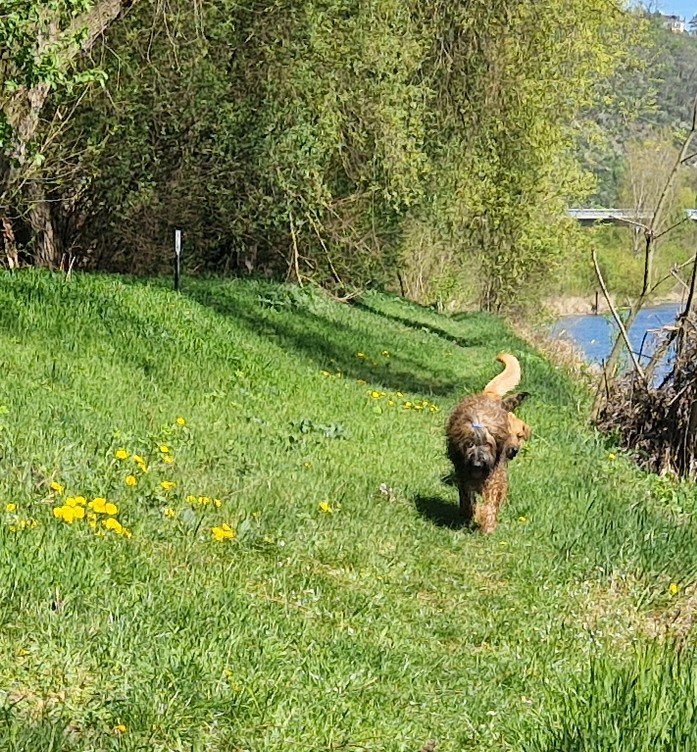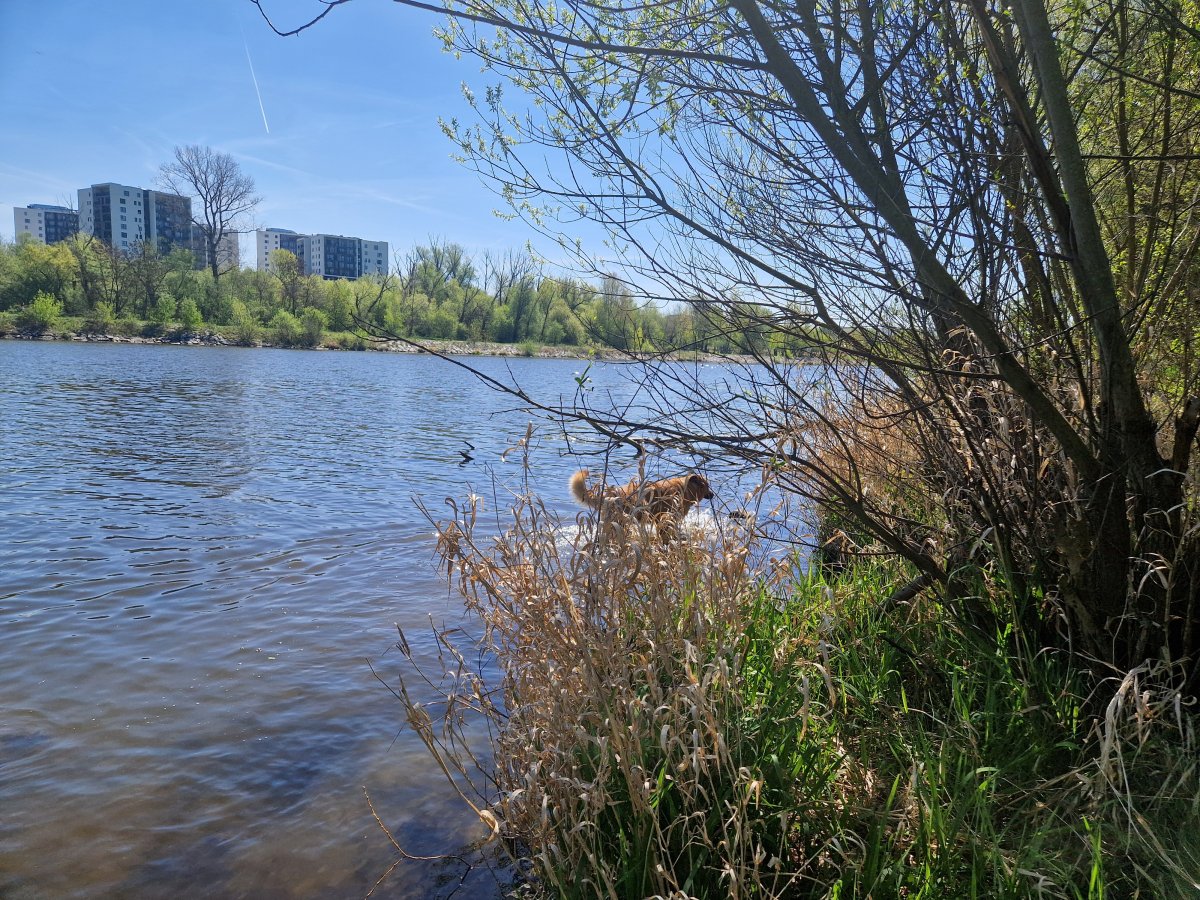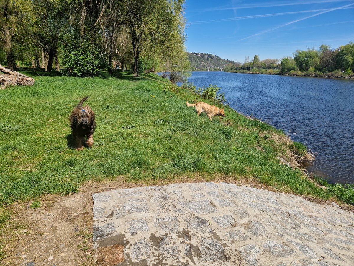 v 10.45 jsem vyrazila s Dafčou kolem řeky,lázní k zimáku,kde čekala kamoška,a vyrazily jsme ke splavu,od něj dál podél pole,pak přes silnici,těsně podél řeky-slunce svítilo,vítr vál a Dafi se táhla….ale vedro nebylo,já navlíklá..