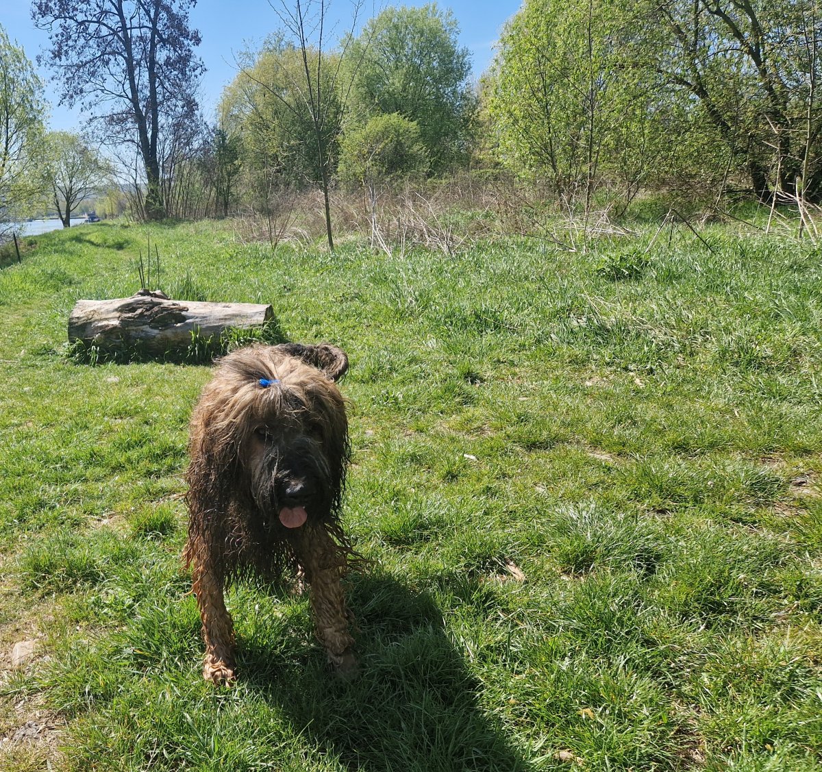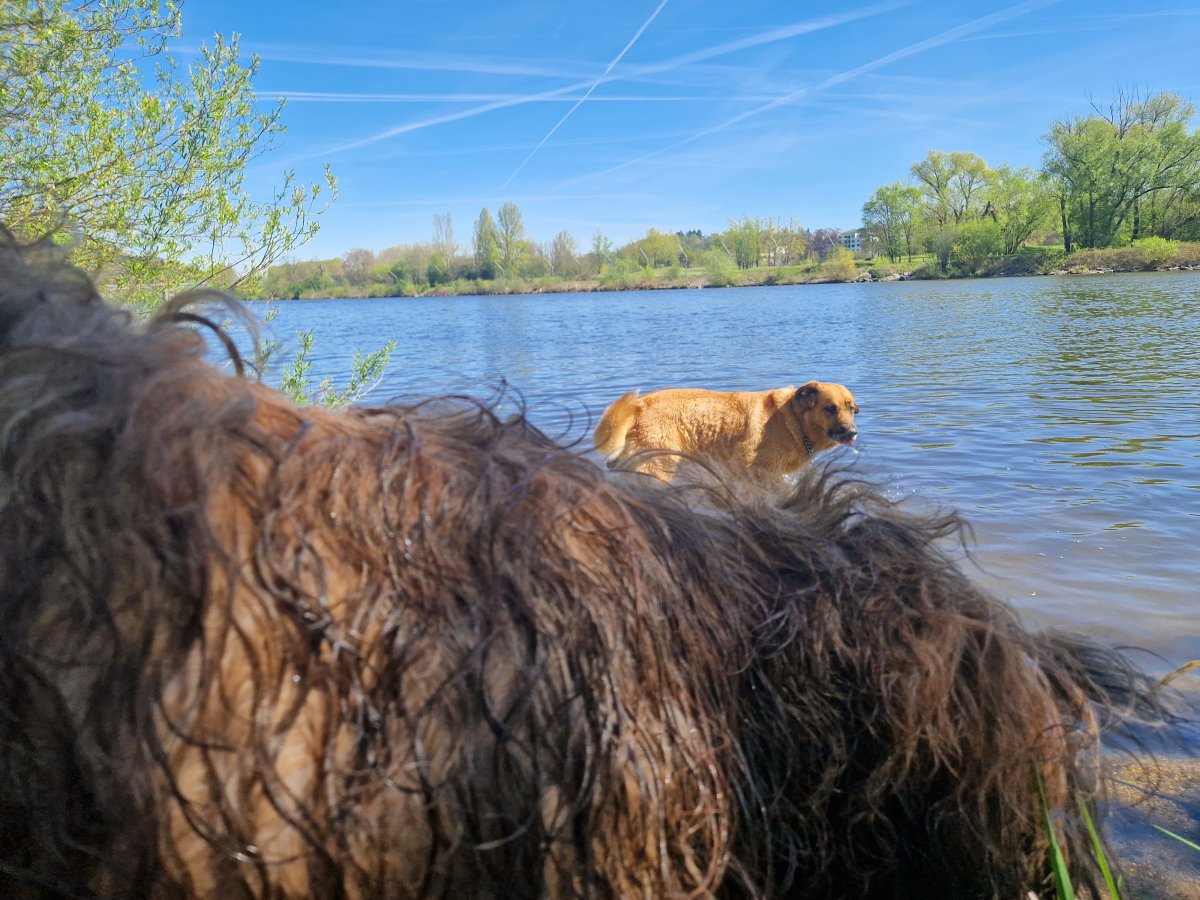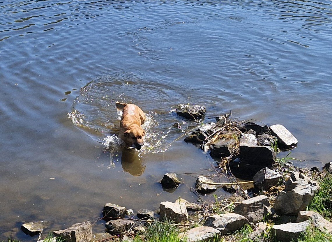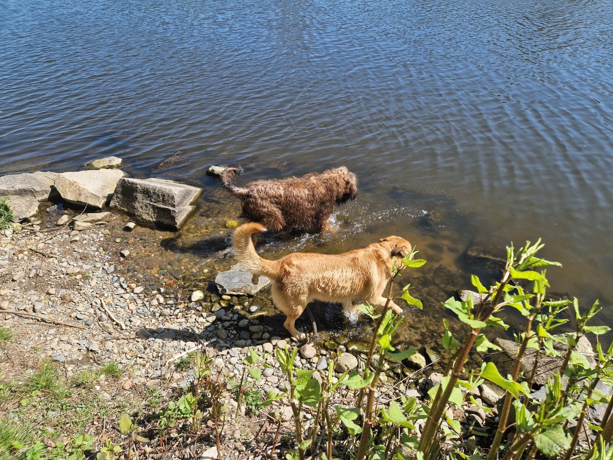 no u splavu jsme zjistily,že jsme šly celkem kus a daleko,na to,že máme být za chvilku na obědě s druhou kamarádkou,která na něj jde v přestávce…tak jsme jí volaly,nebrala to-už vyrazila,no začaly jsme hooodně fofrovat,bohužel,Dafi udržovala své líné klidné tempo-mám dovolenou,mám čas,a když vidím paničku,je to dobrý-zrachlila,jen aby si vzala ždibec pamlsku a a jabka,a zase se plahočila kus za náma…u zimáku kamarádka vyrazila klusem na místo srazu,a já klusem s Dafi v náruči k tátovi,kolem řeky,dom jsem dolítla s Dafčou splavená,mokrá,tak Dafča se napila a odpadla,já se převlíkla a pádila za holkama,-po obědě-kdy si kamarádka ždibec prodloužila přestávku😀,jsem omrkla zverimex,knížky a časáky,a došla dom