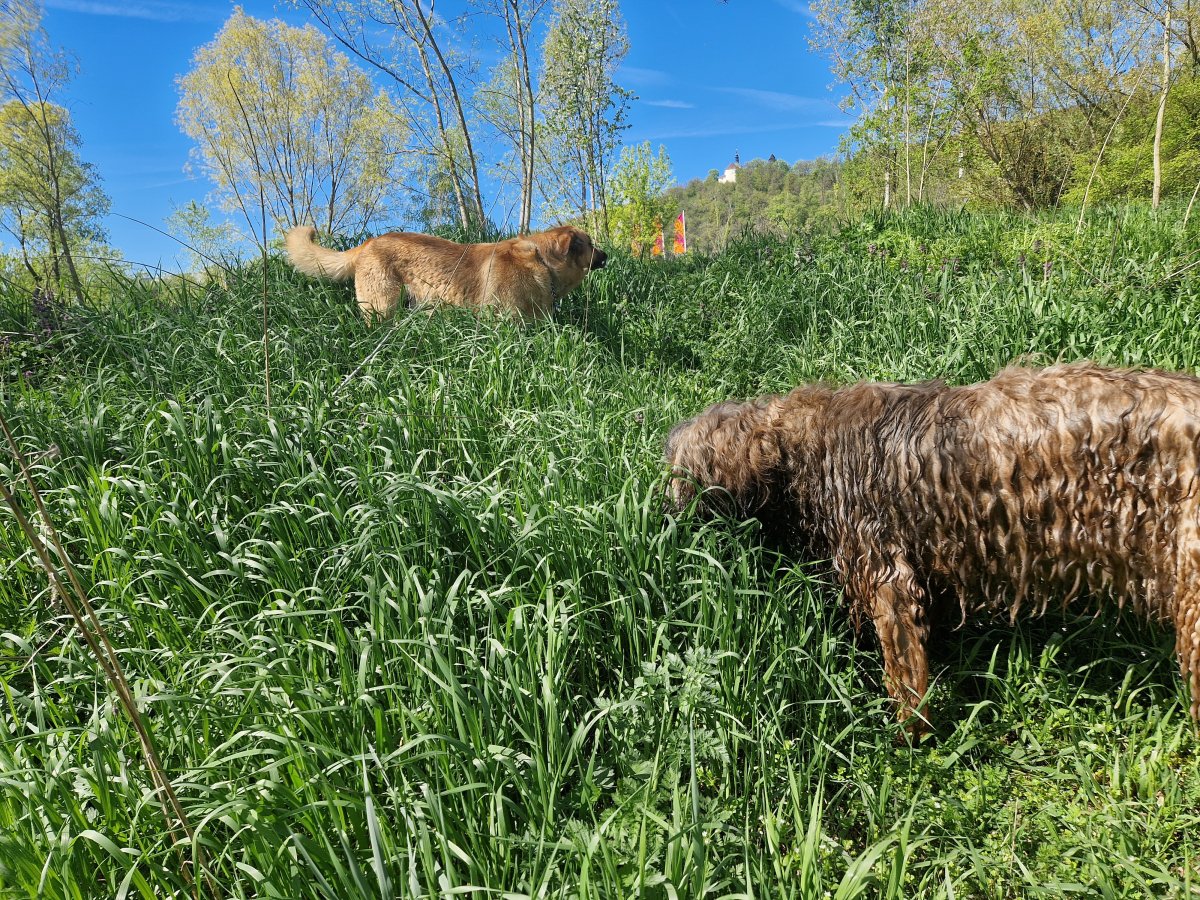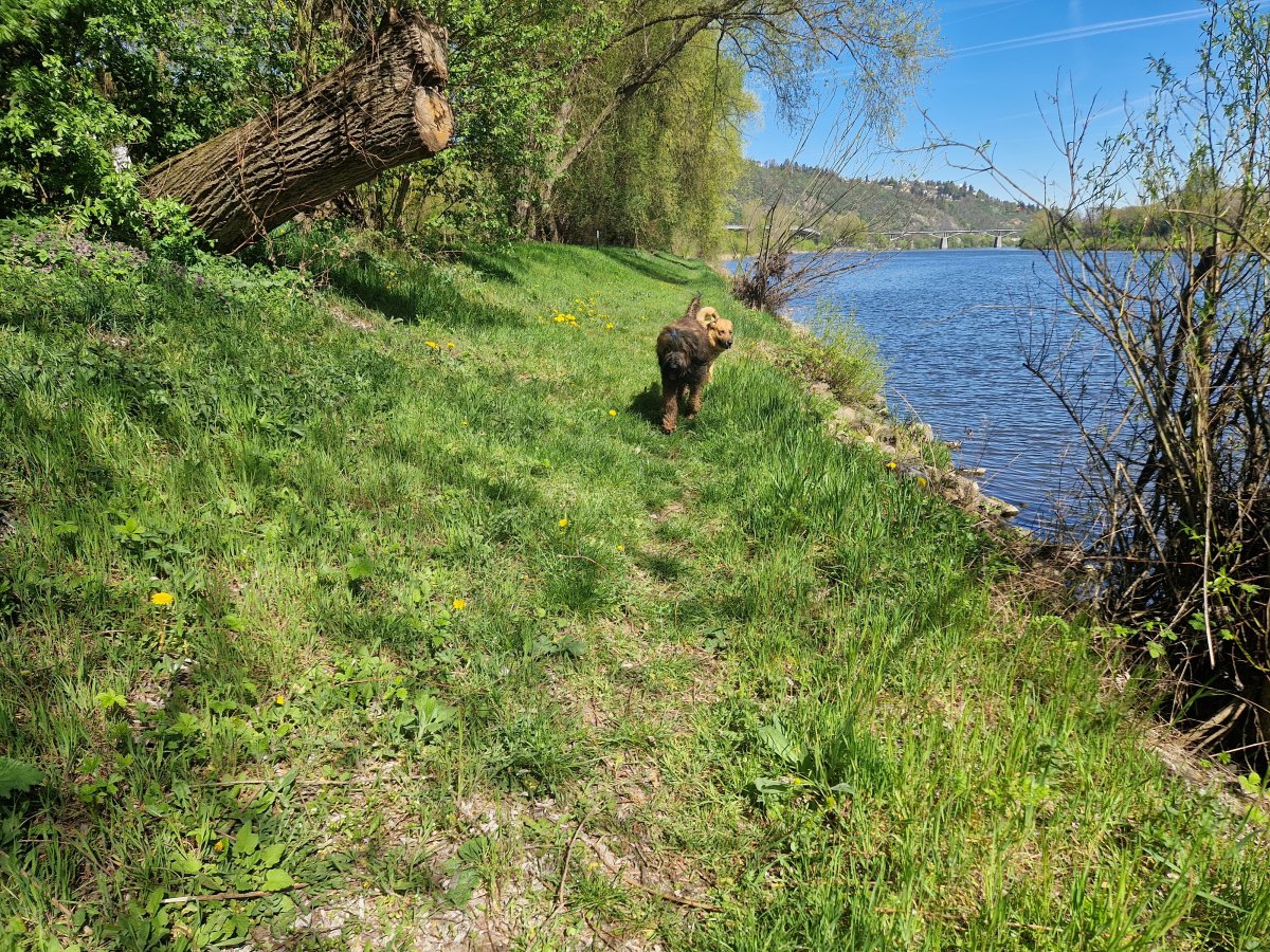 ve čtvrtek ráno jsem s Dafčou vyratzila podél řeky,kousek směr splav-Dafi se převlíkla za želvu,táhla se jak šnek,a zrychlila,jen když mi běžela ukázat lavičku,…to si šla pak pro jabllíčko,rozešla se pak za jedním stavařem,co šel cestou směr-tátův byt…tak šly s ním-pýán na ni-néé,se mnou nechod!!Dafi nikdo neřekl,že s cizíma pánama se nechodí…,no,další stavař u lázní mi řžekl,že pejskovi se nechce…-ehmmm-všimla jsem si😀