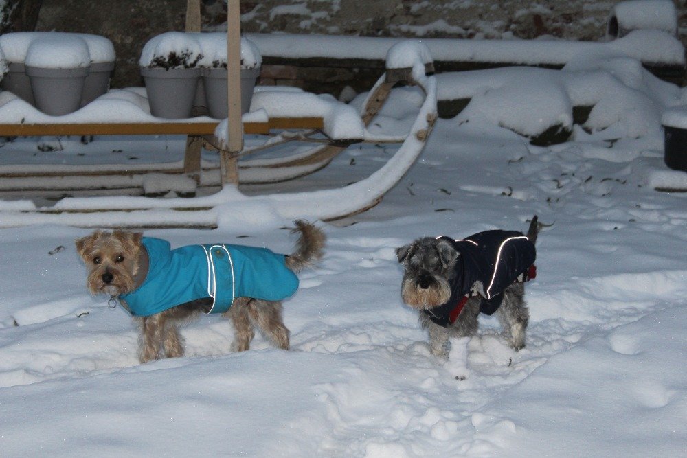no obvyklý okruh po Ždánském lese jsme cestou z veteriny vzdaly,oba psy klepali kosu i oblíklý,v lese by zapadly,tak jsme daly vycházku po městě,koupila jsem Dafině ponožky na miminko,natáhla-vypadá v nich jak tenistka🙂a su zvědavá venku…,no a k dědině dojet už mazec,zasněžená silnice,dvůr i zahrada pod sněhovou peřinou,furt sněží,tak nevím kde budu odpo venčit…za barákem pole/les,před barákem silnice bez chodníků…