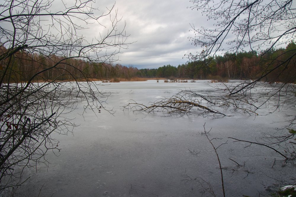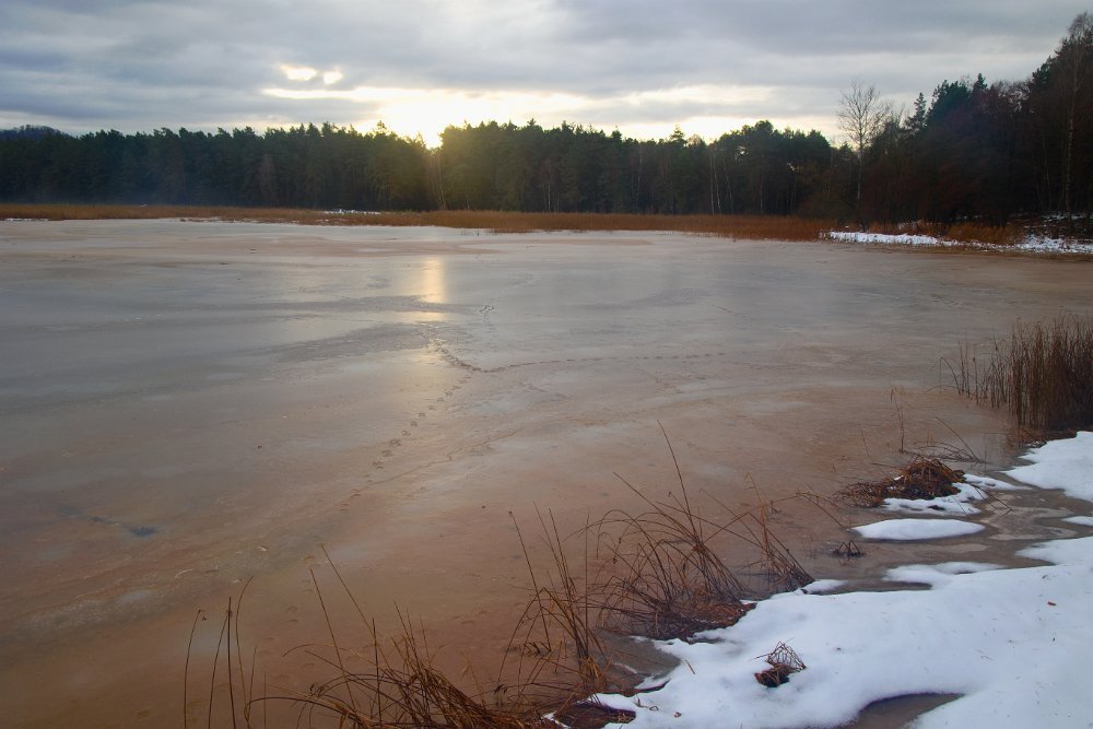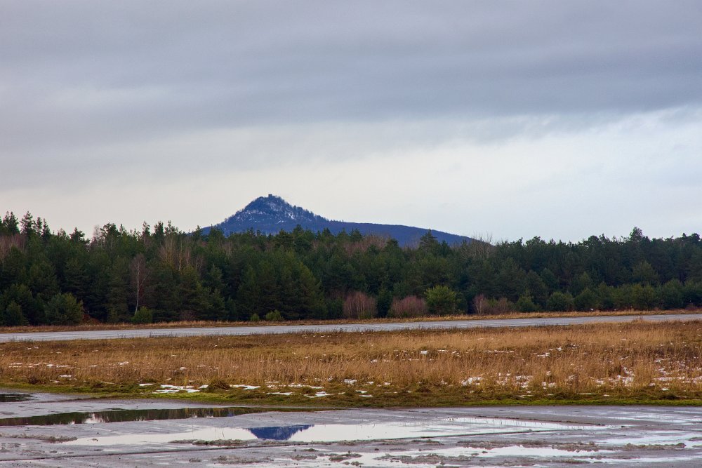 a teď ty nepsí - první není rybník - to je hradčanské letiště s ralskem v pozadí, pak jsou dva hradčanské rybníky (bezejmenný za letištěm a Držník), pak obleva za humny a dnešní zimní