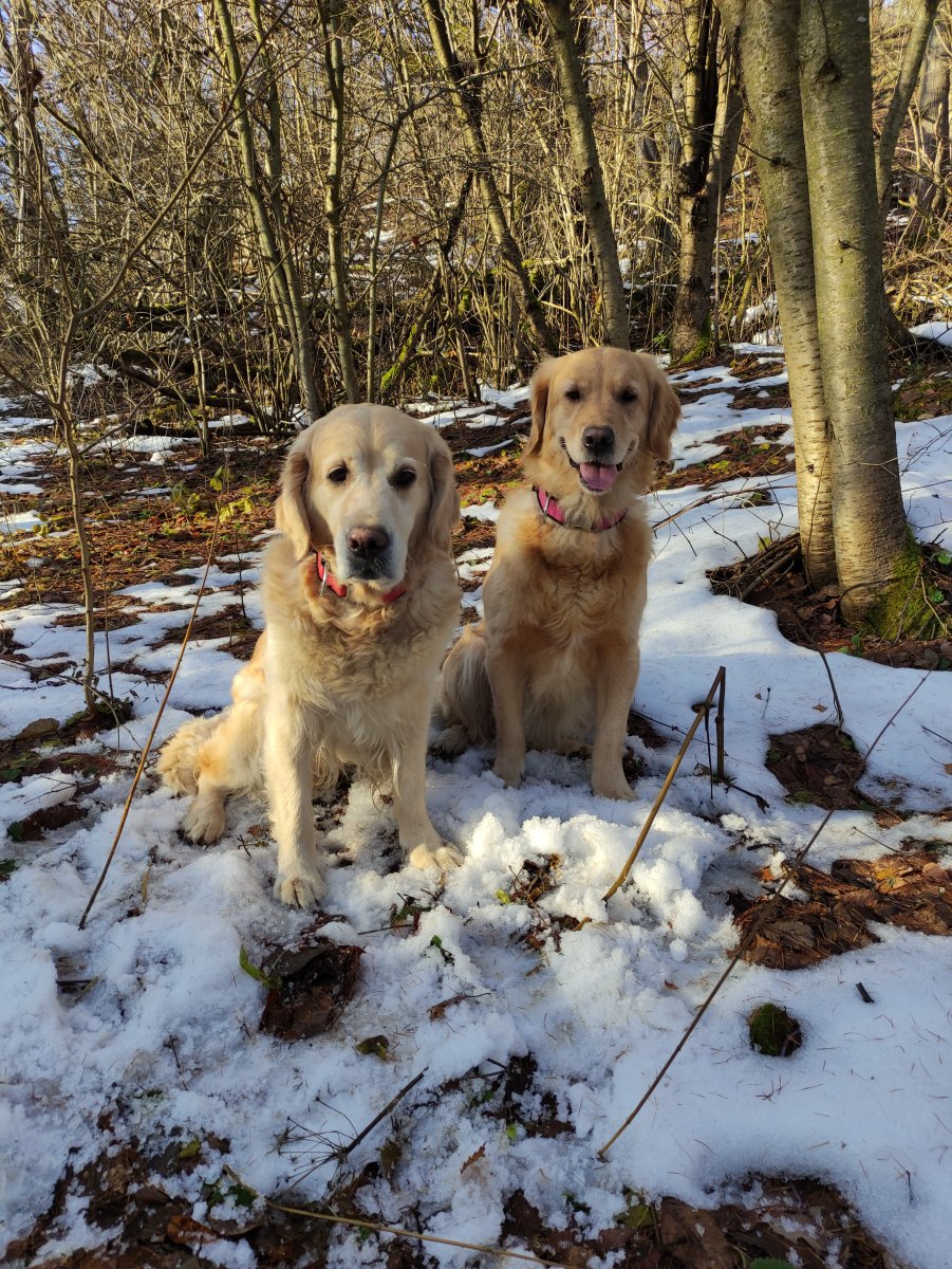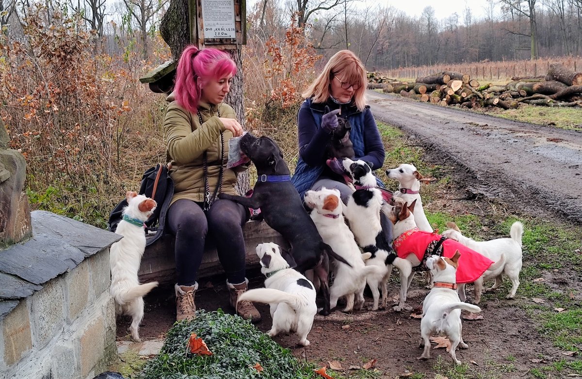 Tiskne, tiskne. Je u nás sotva dva týdny a Merry je zatím její hlavní průvodce. Chucky na té procházce byla vlastně poprvé s celou smečkou, tak byla ještě trochu připrdnutá. 🙃