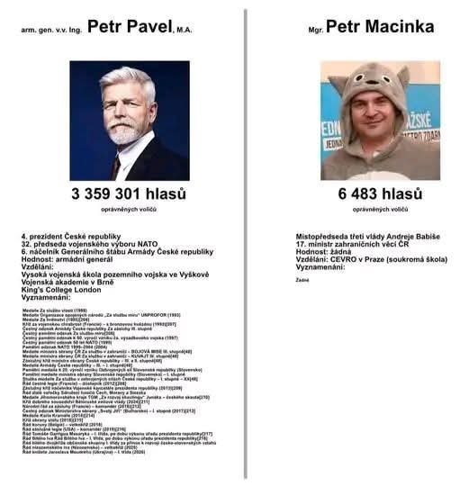 Přesto raději Macinku.🙂 Z jednoho jednoduchého důvodu. Nevadilo by mi že Pavel byl komunista, ostatně to můj táta i děda taky, ale “hadí” převleky to mi vadí. Nejhorší lidi na světě jsou prodejný “svině” co názor to klam sledující jen funkci a osobní prospěch.😐 Fuj.. Naopak lidí co zůstali věrní svému přesvědčení, byť to už nebylo vůbec výhodné, tak těch si velmi vážím. A prezident Pavel znovu ukazuje náležitost k určité politické skupině. V neposlední řadě je prezidentem “větší ruské vesnice” a musí trousit při každé návštěvě Ukrajiny stíhačky ( tedy ani ne jednu letku) a ukazovat světu co? Nebo snad Rusku? Ježiš z toho se Putin určitě potento.😀 Za pár dní Ukrajina mínus 4 stíhačky z ČR a co jako? RF má dle odhadů 3200 bojových strojů plus minimálně 1000 námořnictvo. Ono ale již to bude víc, protože RF zbrojí čtyřikrát rychleji než “obětuje” na Ukrajině. To fakt ty čtyři stíhačky z ČR vytrhnou.😀😀