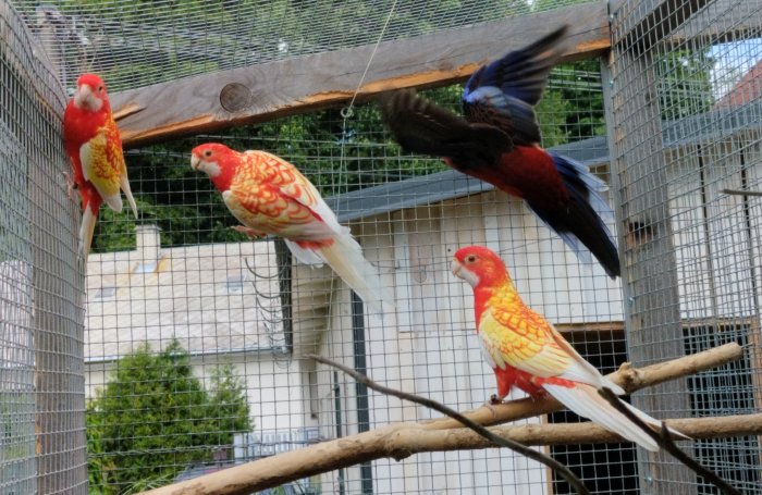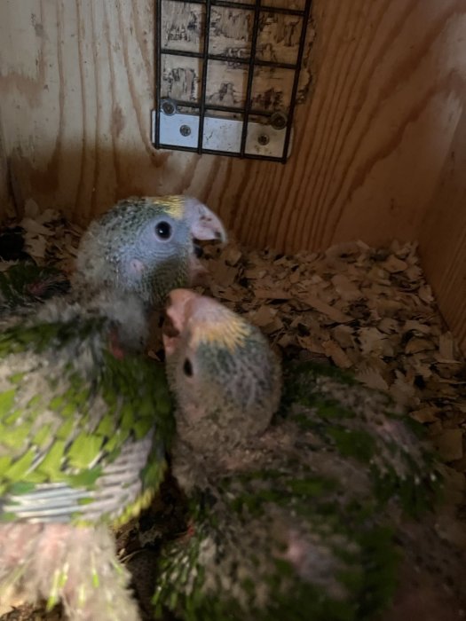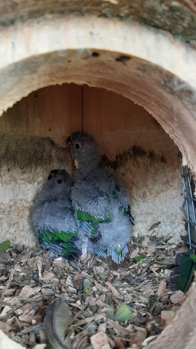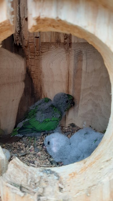 Druhý pár aratingů škraboškových hnízdí vždycky o měsíc a půl později než první. Zatímco od prvního páru už jsou tři mladí na vylétnutí u druhého mají pár dnů, také 3 ks.