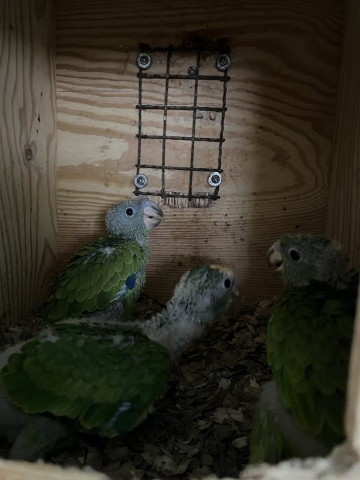 Týden se už seznamují s prostředím mimo budku 🙂 Jeden ze tří mlaďochů