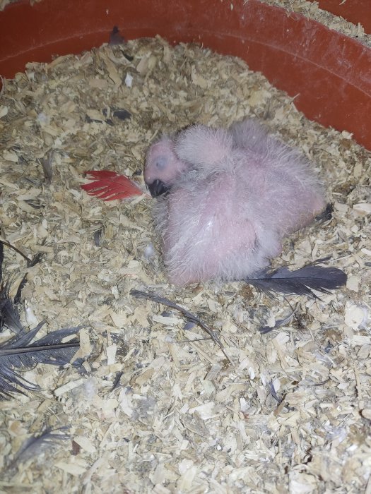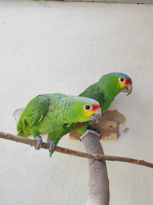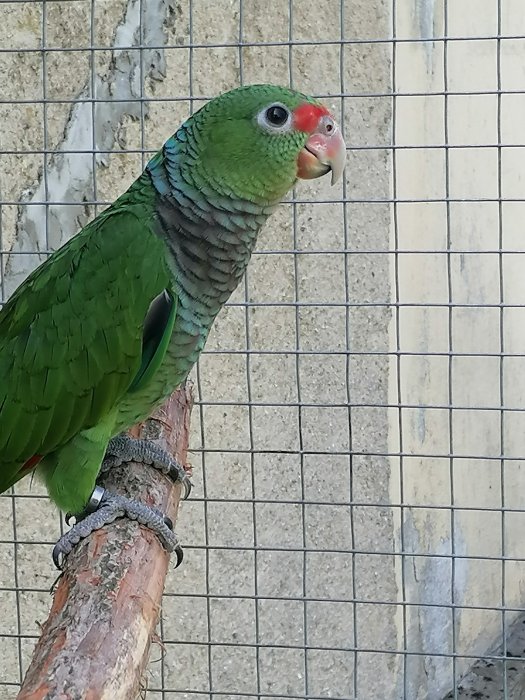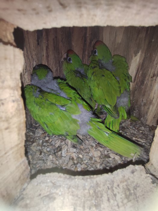 Amazoňan žlutolící, podle DNA samice. Starší aratingy škraboškové 2 samci, jedna samice. Druhý pár mláďata v budce měsíc stará.