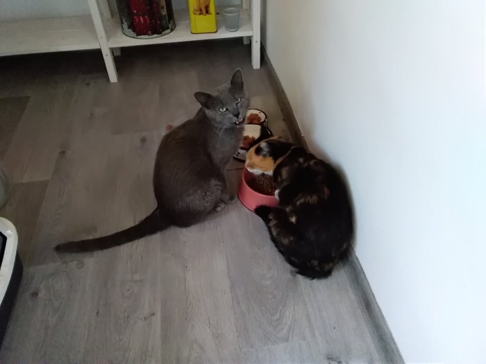 Tak Miki na mě ráno za dverma vyrvaval, jako kde jsem, že ma hlad🐱.. Než jsem zaběhla pro tablet, tak už Ferda odešel od misky, ale chytla jsem ho u vody.. Pijí všichni jak diví.. Králíkům chodim i 3 krát za den některým dolivat, kde je jich vic.