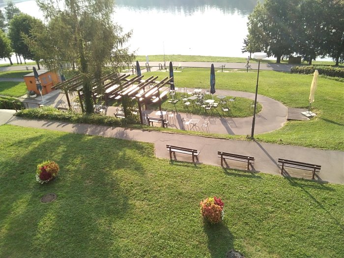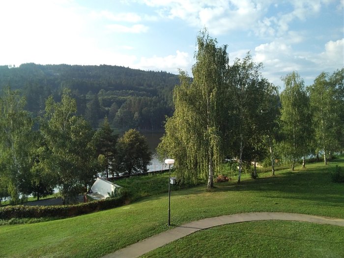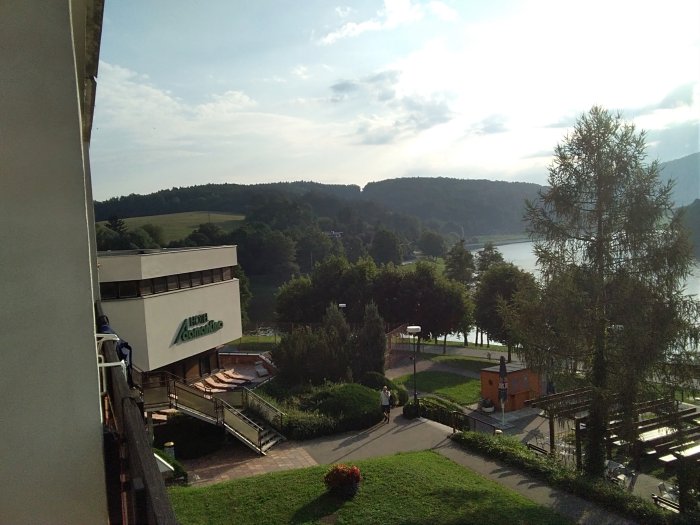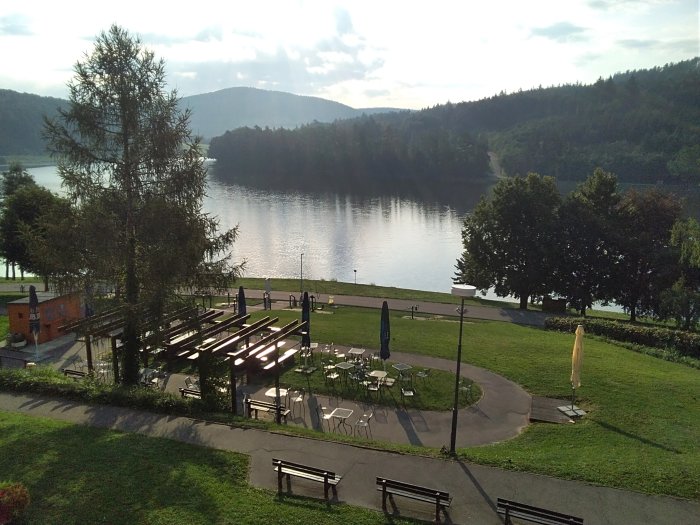 Tak se mi podařilo i se zaregistrovat.. Včera Jarus už plavala asi půlhodinu v přehradě, já seděla na břehu a jistila ji.. Dojely jsme ve 2 hodiny.. 2krat se vracely, zkrz uzávěry, ale pak jsme šly na horké maliny, a ledové kafe s bejlis.. Navečer ve stánku Radegasta 10tecku za 36…takže pitný režim dodržen.. Reni, nepit bych asinevydrzela, ale ráno ze mě teklo neskutečně u snídaně.a to jsem proletela vlaznou sprchou. Curky potu po tvářích.. Jídla neurekom.. Do středy mame jen snidane a pak plnou penzi.. Jsme si prodlouzily wellnes na celý týden.. Místo 3 dní.. Teď nám tu pere slunko, odpol. je tu stín.. Fota jsou z dnešního rána papa