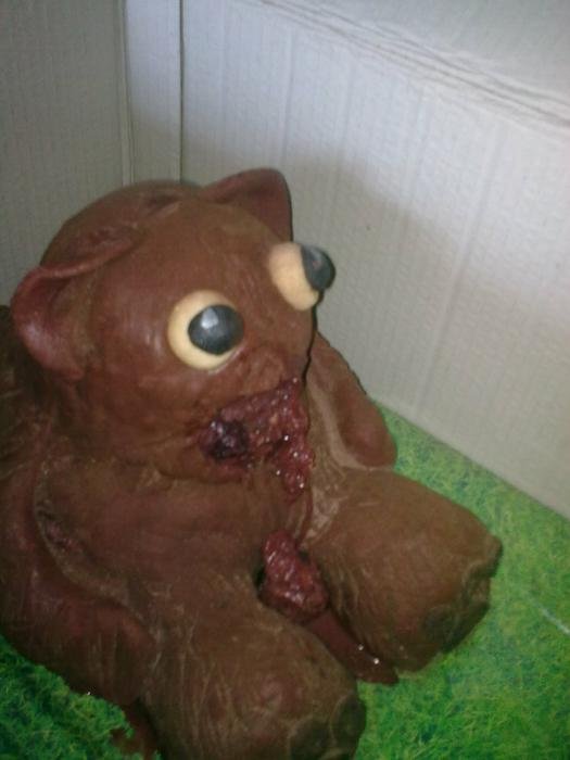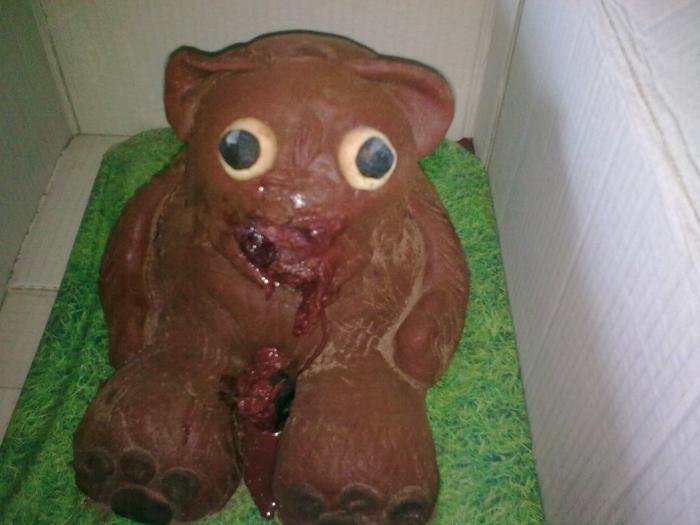 Ad dorty………. já jsem též jednou neodolala a objednala muži svému dort……… To co vidíte není dort načatý, ani že bych ho transportem zničila, takto jsem ho již dostala. Objednávala jsem medvěda Brtnika, netušila jsem, že obdržím medvěda s průstřelem břicha a po potratu. Stálo mě to slabých pětsetkáčées 😀 😀 Dodnes na to nemohu v noci zapomenout a bojím se podívat pod postel 😀