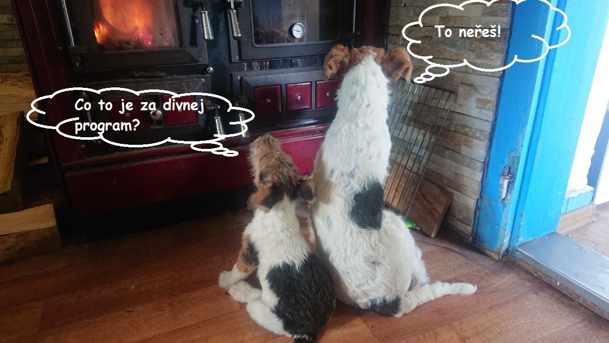 U nás už se štěňák zabydlel. Velkej foxterier si ho vzal na starost a během pár dní se stali úplně nerozluční