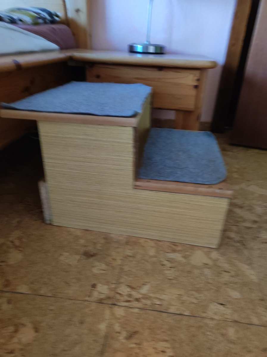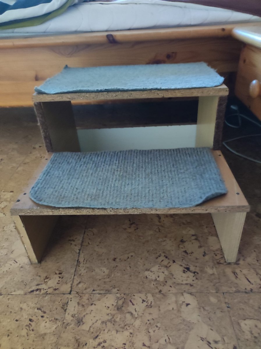 U jezevčíků se dávají k posteli nebo gauči rampy nebo schůdky ne proto, že by si tam nedokázali vyskočit, ale aby neskákali dolů. Je to blbý na tu jejich dlouhou páteř. Ty dopady dolů. Mám schůdky u postele, protože mám postel docela vysokou. Tří je vzorně používají, čtvrtá na ně prdí a skáče si kudy chce. Jinak po schodech lítají všichni milionkrát denně nahoru i dolů, bydlíme v patře. Schůdky k posteli jsme vyrobili s taťkou za chvilku.