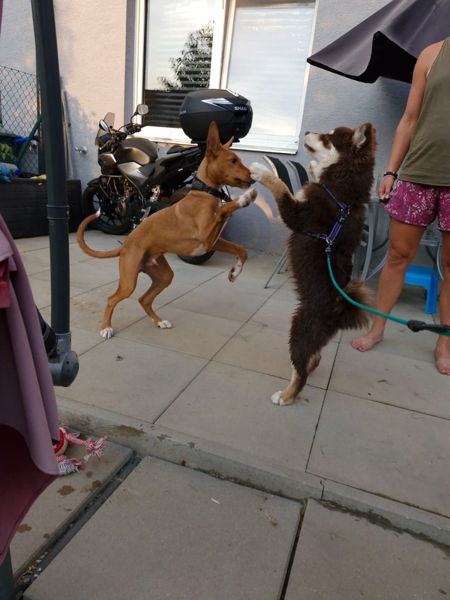V neděli přijedou mladý k nám, jenom se štěndem, staršího psa nechají doma, aby to na malýho nebyl tak velkej šrumec, až se bude seznamovat s mýma pejsama. Myslím, že Maťulkovi se bude moc líbit, protože je povahově jemnější, něžnější a hlavně…chce si hrát na naháněnou s hračkou…chce se o ní tahat…a to se líbí i Matýskovi, tak uvidíme.
