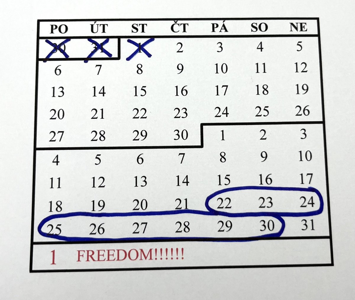 Neee, v duchu neee, vokýnka, Vy ty vokýnka mušíte škrtat v reálu. Abyste si to pěkně užila. Každej den, klustá fixa a křížek, pěkně pomalu ho vymaluju… a těším se z toho, že zas sem kousek ke svobodě.