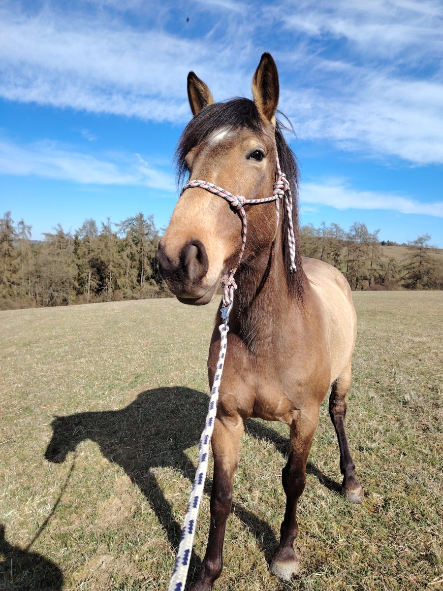Ale umí trubka i pobavit. Šla jsem pro ní do výběhu. Nandám ohlávku a chci vyrazit… jenže ona dřív vyrazila po druhé kobyle, a já to nečekala, takže mi vyrvala vodítko z ruky… tak se otočím, že jí jdu chytit. A ona normálně ze země zvedla to vodítko a otočila hlavu ke mě tak, že mi ho v podstatě podala 😄
