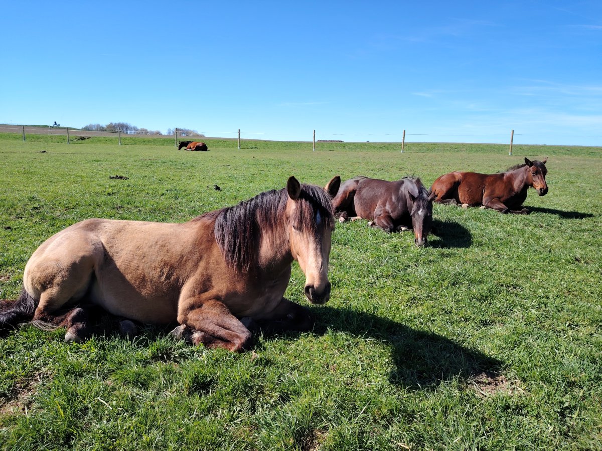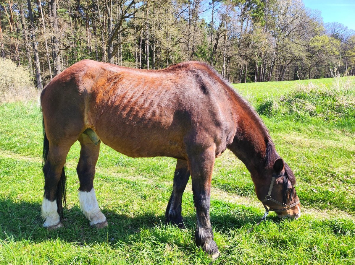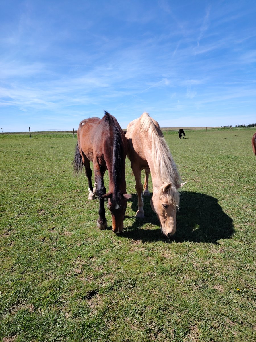 S žebřiňákem na procházce 😀. V břiše mu už škrundá tak o půlku míň a ne tak nahlas. Ve stádě ho 3 valaši pořád trochu šikanujou, dneska jsem jednoho trochu porovnala bičem, když nechtěl pustit Cipíska k vodě. To se starejm hubenejm koníčkům nedělá.