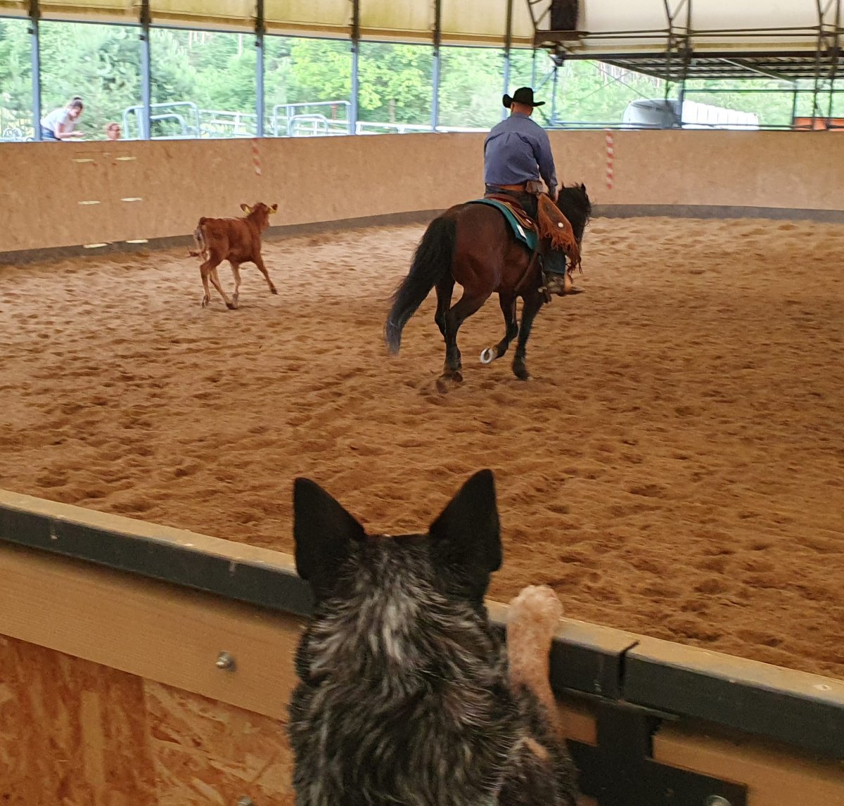 Já jsem o víkendu navštívila jiný svět … jela jsem se s kamarádkou podívat na westernové hobby závody. Pro mě jako lesojezdce a ještě angličana věc z jiného vesmíru. Musela jsem se jedné milé paní zeptat alespoň na základní pravidla a bodování, abych nečučela jak tele, pak už to bylo fajn. Měly jsme pocit, že jsme tam byly jediné nezávislé divačky, jinak všechno byli známí, ale i tak byli všichni fajn, když jsme se ptaly, dozvěděly jsme se. Při nahánění krav se s Piraně spustilo tovární nastavení, chvěla se, kvílela, štěkala a chtěla mermomocí do areny, že to těm kaubojům ukáže, jak se honí kráva 😀 ani tak nás z arény nevykázali a ještě si jí fotili, jak čučí na zadních přes hrazení, aby dobře viděla. Takže za mě překvapivě prima pohodový den a ranč nádherný jak z filmu.