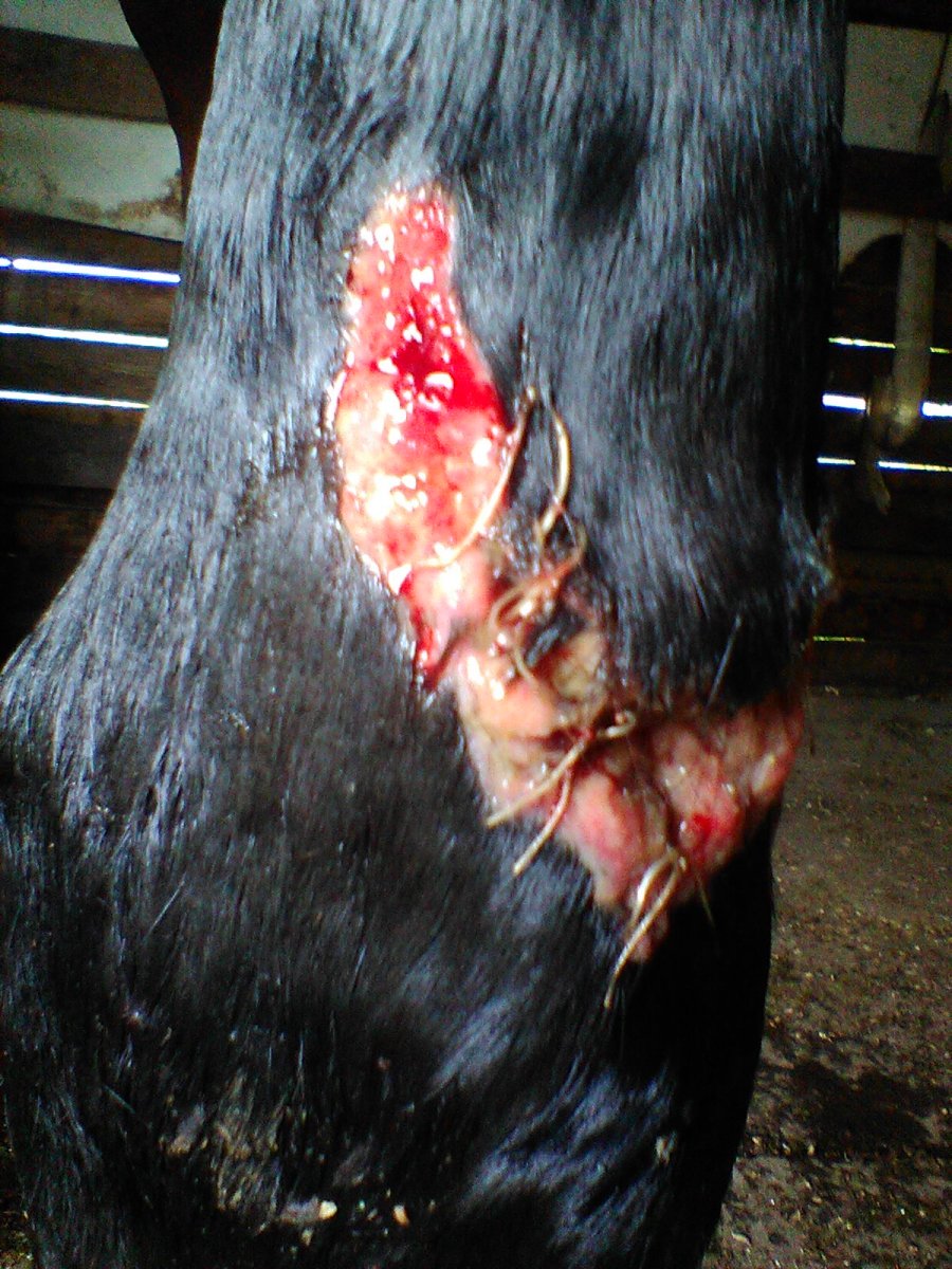 minulý týden, někdy jak jsem se chystala nechat ránu chvíli na vzduchu, jsem odhalila při převazu toto (první fotky). No uf, tak to byl šok. Na konci týdne dojel veterinář, vytahal stehy a netuším, co s ránou dělal, nebyla jsem u toho. Zafáčoval a říkal, že do neděle by mohlo vydržet. Nevydrželo, v sobotu jsem musela přemotat. Nebudu vás napínat, vypadalo to takto (druhé fotky).