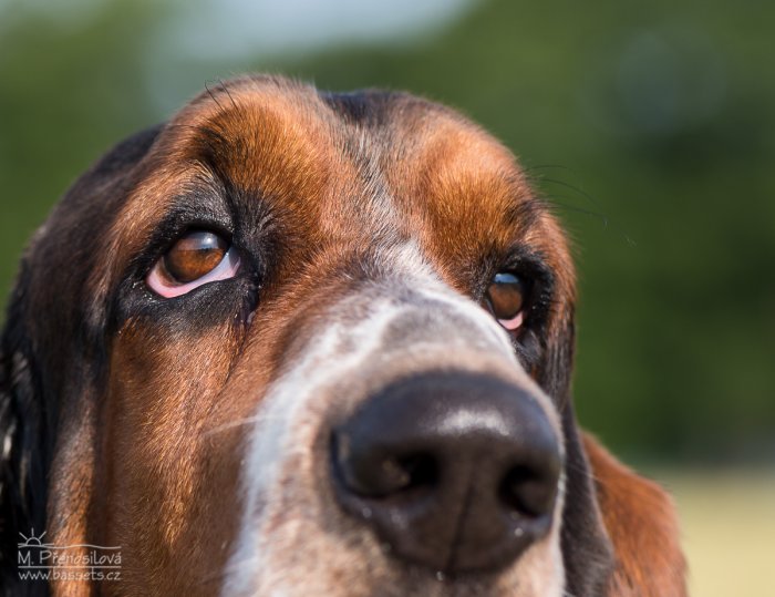 Široká hlava, oči daleko od sebe, klidný pohled...