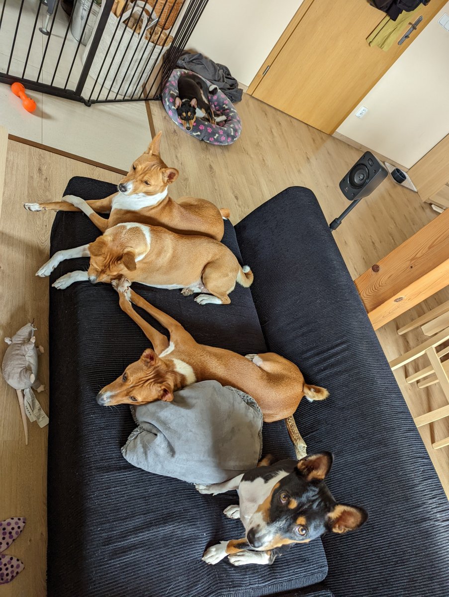 PS: fotka je, když jsme se stěhovali, ještě nebyl nikde žádný gauč ani nic na co by se dalo lehnout, ale někomu vypadl z krabice podsedák, tak si lehla na něj... A ještě komplet moje a mamky smečka při hlídání 3 roky zpět.