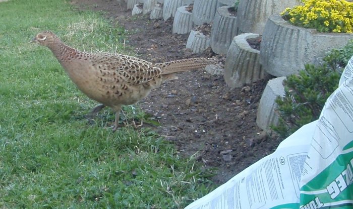 Balu:Tak toto se mi dneska nečekaně objevilo na zahradě - bažant, může být z myslivecké bažantnice? V přírodě už jsem bažanta neviděl dlouhou dobu.
