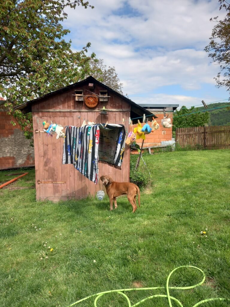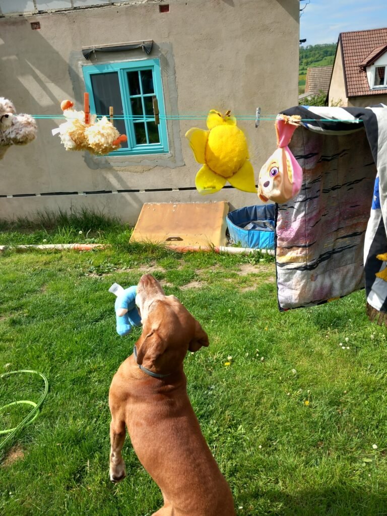 To je Rumíček. Miluje plyšáky, a ještě víc miluje dostávat plyšáky…. jak vidí plyšáka, co přišel dom, stává se z dokonale vychovaného pejska zločincem kradavým. Zde důkaz - vypralal jsem plyšáků hromadu ze sekáče a dala je sušit….a pak ho nenápadně pozorovala 😀