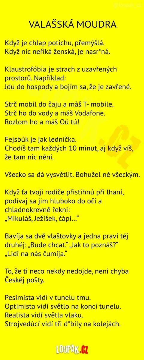 Přijde pán na pohotovost na chirurgii. Ptají se jej, co má za problém… No a pán říká:"Já mám takový problém, že si o sobě myslím, že jsem můra!" Dr. na chirurgii (chápavě):"Ale ano. To se může stát. Ale zajděte si s tímto problémem na psychiatrii…" Pán:"No jo, ale u vás se svítilo!" 😉