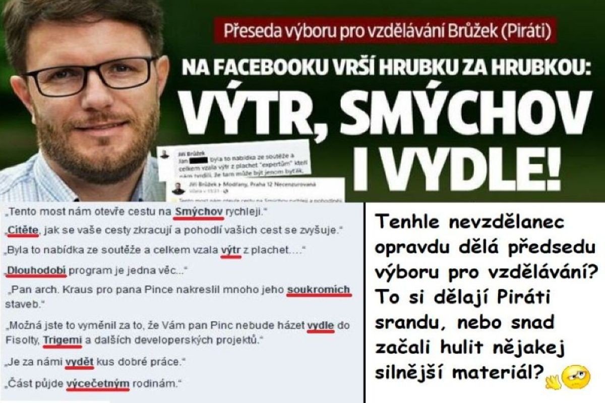 “Co tedy zástupce Pirátů vystudoval? Oficiální medailonek na webu jeho mateřské strany uvádí, že se vyučil kuchařem a poté absolvoval nástavbu na hotelové škole. Praxe v oboru vzdělávání a výchovy mládeže? Ani v tomto případě není jasné, zdali vůbec nějaká existuje. „Od dvaceti let je aktivním investorem do akcií a nemovitostí. Od roku 2014 se spolupodílí na Trend Reportu Asociace pro rozvoj nemovitostního trhu,“ stojí na stránkách. Brůžek mezi roky 2019 a 2022 působil na Praze 12 ve funkci radního s kompetencí sociálních věcí nebo bytové politiky. Řadu funkcí má i letos.”