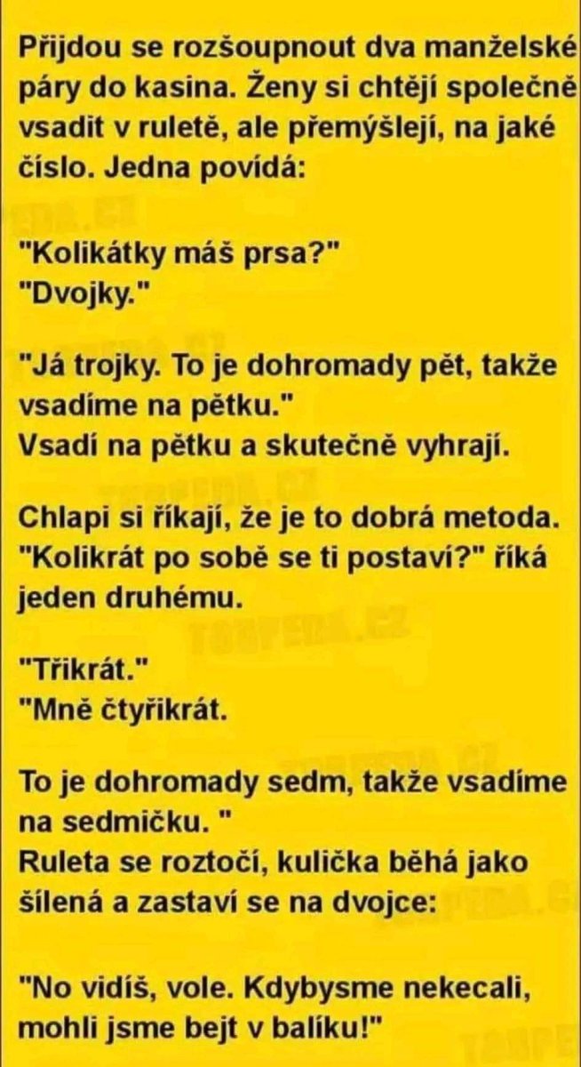 Se nepoto. Proč se v jiných tématech podepisuješ a v politice a tady ne? Tohleto drobení kuřat a plýtvání nemám ráda. Nekupuji řízky, samotná křídla atp., k tomu dostane člověk polystyren … Poláci prodávají kuřata s krkem. Ale sáček s vnitřnostmi tam taky není. Ale nevidím je běžně ani v krámě, málo. A ryby bez hlavy. Podle mě to šrotujou do krmení pro psy. Mě napadlo, esi náhodou ty vnitřnosti v sáčku uvnitř kuříka nezakázala EU, je jim to podobné. Ale asi vyhrál kšeft. Uděláme ze spotřebitele debulla.
