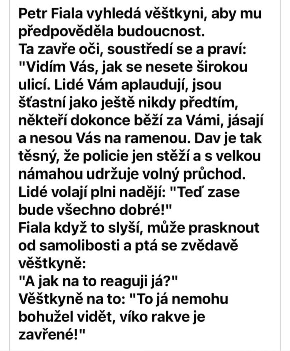 Včera jsem se svými kamarádkami vyrazila na večírek. Manželovi jsem řekla, že se vrátím o půlnoci. "Slibuji ti, miláčku, že se nevrátím ani o Minutu později!" prohlásila jsem a vyrazila. Ale večírek byl fantastický. Drinky, tanečky, znovu drinky a znovu tanečky, ještě víc drinků... bylo to tak skvělé, že jsem zapomněla na čas! Když jsem se vrátila domů, byly tři hodiny v noci. Vcházím do bytu, jako myška otvírám dveře a vtom slyším tu zatracenou kukačku v hodinách, jak kuká třikrát! Když jsem si uvědomila, že manžel se při tom kukání může probudit, zakukala jsem sama ještě devětkrát... Byla jsem na sebe hrdá, že i když jsem ožralá jak dělo, dostala jsem takový dobrý nápad a podařilo se mi vyhnout nepříjemnosti s manželem...! Rychle jsem si lehla a usínala s myšlenkou na to, jak jsem inteligentní. Ráno, během snídaně se manžel zeptal, kdy jsem se vrátila z večírku. A tak říkám, že přesně o půlnoci, jak jsem slíbila. Nic neříkal a ani nevypadal, že by měl nějaké pochybnosti. "To je skvělé, jsem zachráněná.. !" pomyslela jsem si a otřela pot z čela. "Víš, musíme vyměnit ty naše kukačkové hodiny." Zbledla jsem strachy a ptám se pokorně: "Aaano ? A prroč, miláčku?" A on na to: "Víš, dneska v noci kukačka zakukala třikrát, potom nevím, jak to udělala - vykřikla Ó bože!, znovu zakukala čtyřikrát, vyzvracela se v předsíni, zakukala ještě třikrát a upadla se smíchem na podlahu. Kuknula ještě jednou, šlápla na kočku a převrátila stolek v obýváku. Potom mě poslala do prdele a svalila se vedle mě. Pak zakukala naposledy a začala chrápat.