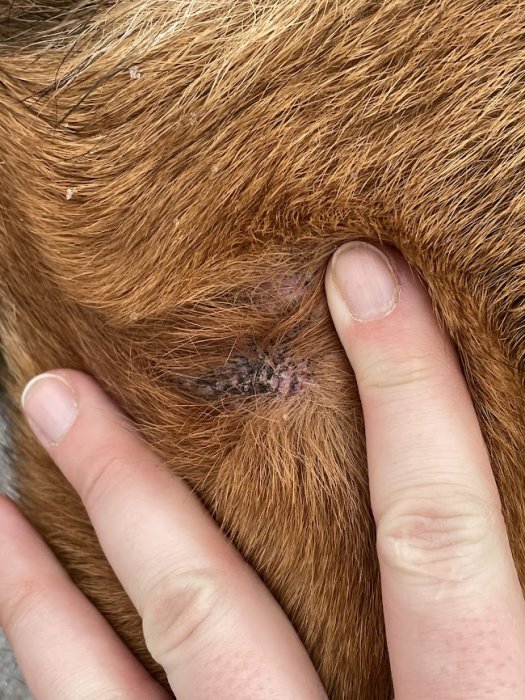 Náš NO to mívá každé léto, protože se chladí na betonu. Veterinář poradil Infadolan cena cca 80 Kč. Ten nám hodně pomohl. Když jsme to měli dříve do živého pomáhalo dát na nohu Enterozoo. Poté co užíváme Infadolan, tak pes má místo pouze bez chlupů. Už žádné strupy. Na podzim to krásně zaroste.