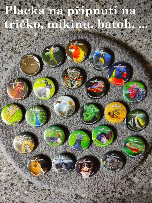 Každý si vyberte placku a 3 samolepky z následujících motivů. Váš výběr mi pošlete do soukromé zprávy zde na webu, nebo na mail zbynek@chovzvirat.cz