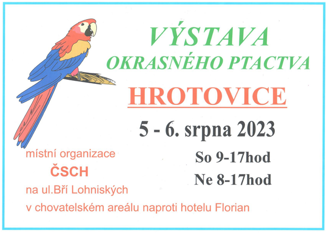 Dovolujeme si Vás pozvat na tradiční výstavu papoušků, která se uskuteční tento víkend ve vnitřních prostorech chovatelském areálu. Vystaveno bude víc jak 110 druhů papoušků, mezi nimi např. Kakadu inka, Lori smaragdový, Lori čárkovaný, Aratinga žlutý-guarouba, Amazoňan vinorudý nebo Amazónek běločelý. Celkem bude vystaveno 7 druhů amazónků, 7 druhů amazoňanů, 3 druhy ar (letos nově velké ary) a nebo 11 zástupců Lori. Akce se koná u příležitosti Hrotovické pouti. Akce se koná za každého počasí. Více informací na Kudy z nudy. Články s fotografiemi z minulých ročníků na Ararauně.