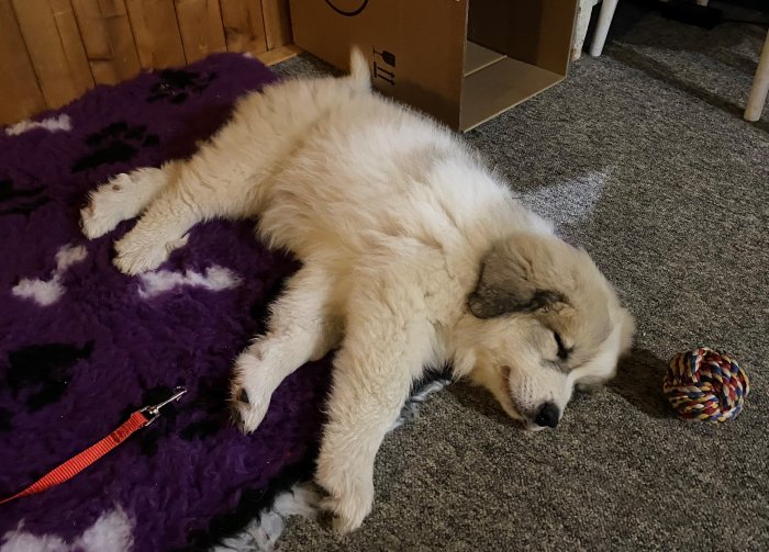Gučák má vlastní postel( mazánek) a v ní péřový peřiny 🤣. Malej stěník spí u mojí postele na starým kožichu. Doroušek má pelech na verandě, páč chce mít přehled.