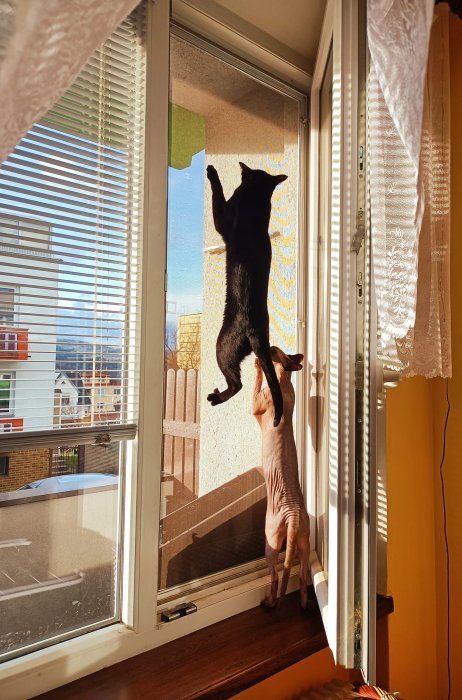 Tak nehoukejte a sundejte to. Už jsou kočkata docela v pohodě. Já ne. Tři praštěný divoký z venku jsou trochu… ale už pěkně slyší na jména. Na pracovní. Záclony nemáme. To je hrozný hadr zbytečný. Závěsy… to je nenapadne, asi už jim leze na nervy, jak je stokrát za hodinu sundám. Na zemi dostanou plno dobrot, tak co by to lezlo nahoru. Jo, potrhalo mi to spoustu hadrů, protože šplhá po mně… škrábe to… krev mi teče… 14 dní práce, no. Ale s jedním kočkou… nuda.