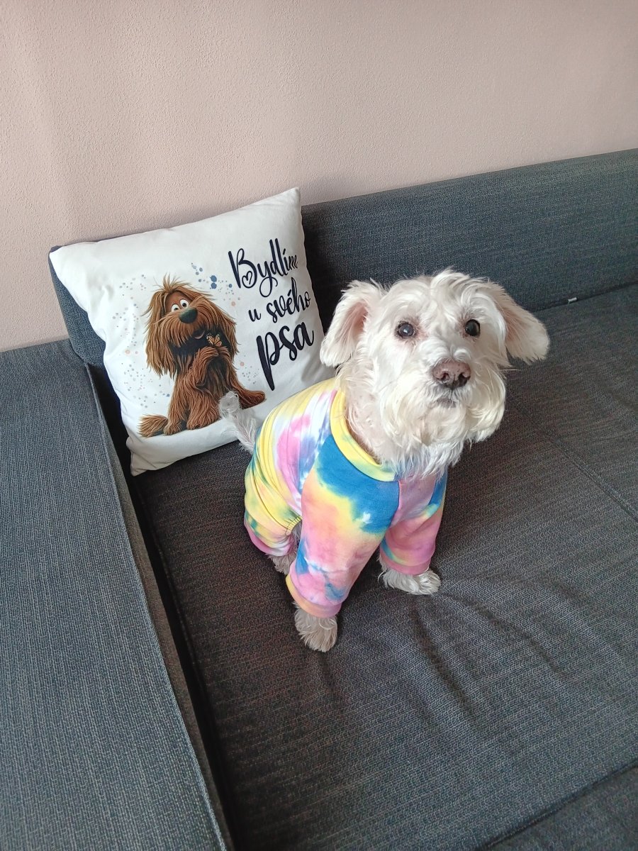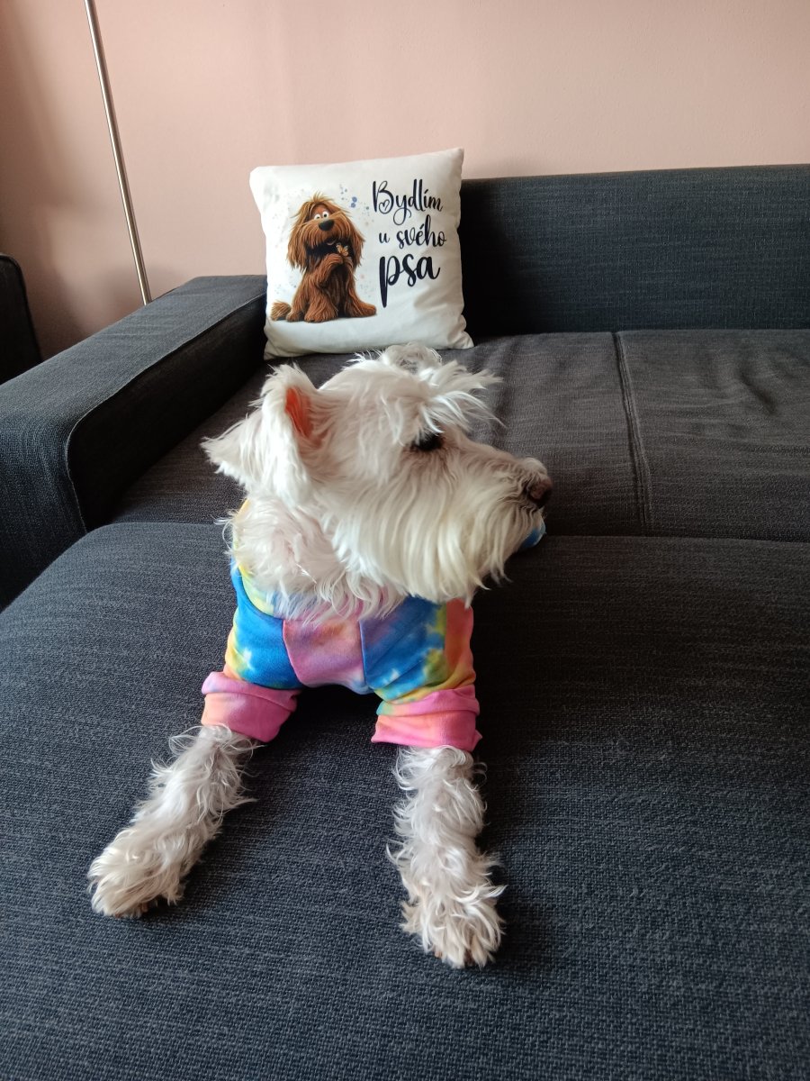 Běloušek má taky levný bavlněný model na spaní na všechny 4 noženky, aby nemusela panička přikrývat v noci. Ježíšek to přinesl i s polštářkem pro paničku….aby věděla….😛