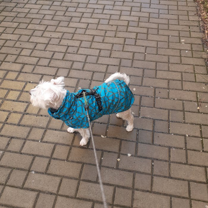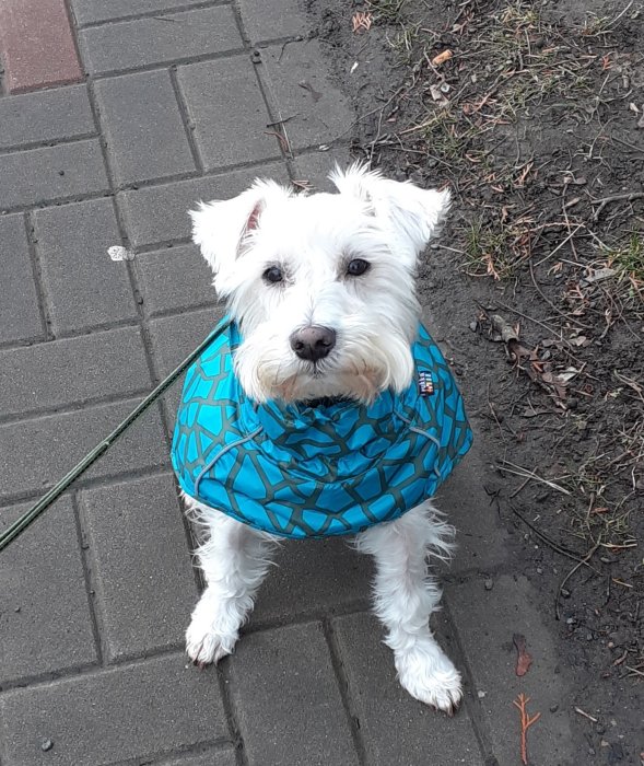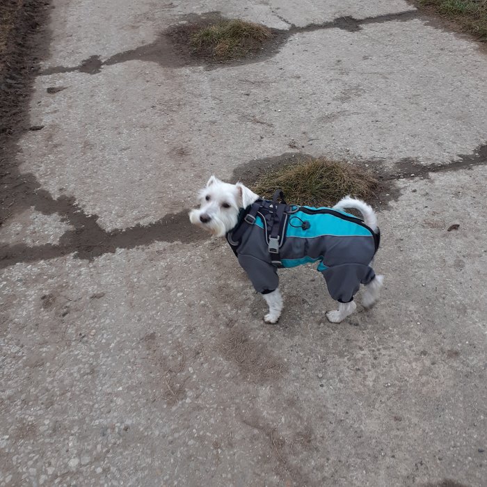 Taky máme rádi s běloušem značku rukka, koupila jsem teď od nich i zimní kombinézu, bělouš je bez podsady a srst je mizerná a nekvalitní, i když není ostříhaný. Pláštěnka už není tak zářivá, jako na přiložených na fotkách, ale s pláštěnkou jiné foto nemám.
