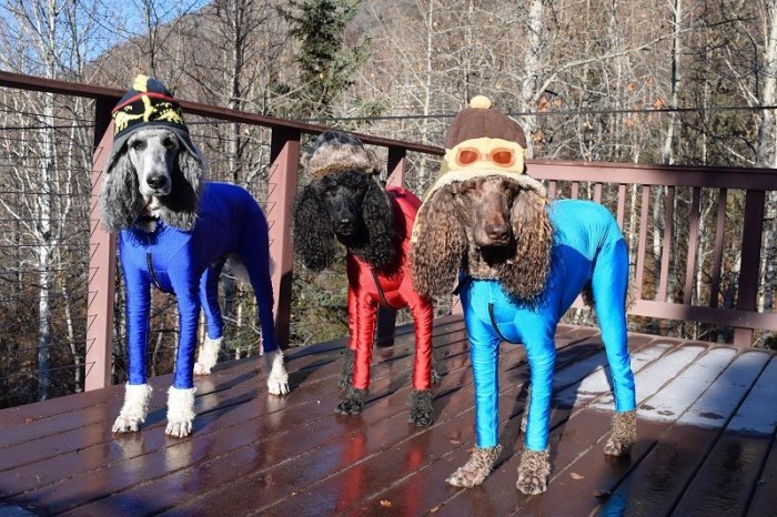 Pro pobavení přikládám ještě fotky z netu, jaké to je mít pudle ve sněhu vedle jiných psů a speciálně pro Zrzavce ukázku obleku, který ještě N E M Á M E.
