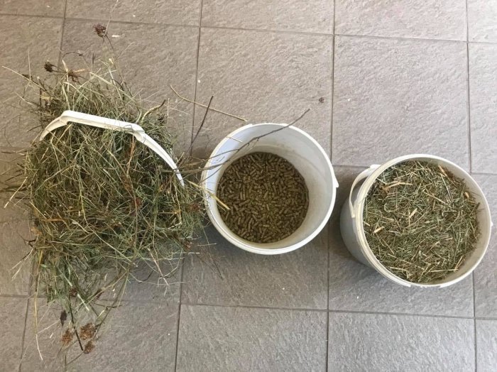 Náš bezzubý valach, 650kg, dostával na noc do boxu 60l krmiva rašelinové konzistence - řepné řízky, vojtěška, senné granule… V suchém stavu toho bylo 11kg. Požíral si to v poklidu celou noc, dával si pauzy…