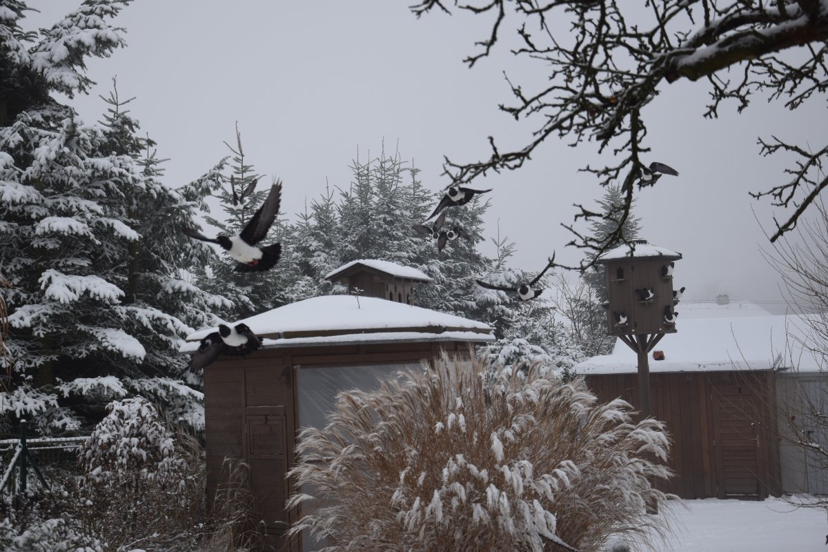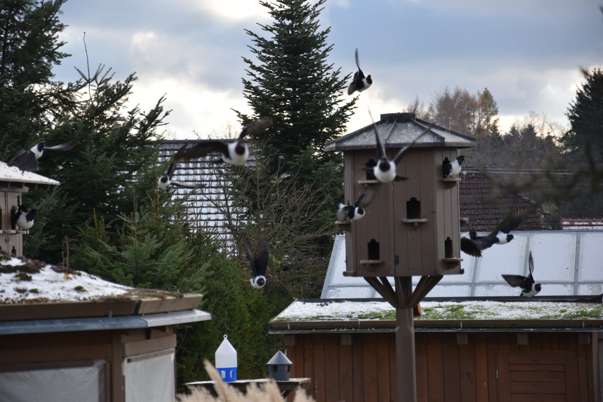 Je vidět, že v Raspenavě se daří “kryticky” ohroženým (nejspíše) jestřábům-na fotce. Proto je ze zákona chráněn. Vyfotit dravce u mne se mi zatím nepodařilo, pokud pominu samce krahujce, který mi zalezl do kurníku. Nicméně, zatím jen přelety dravců a čejky se ihned letem při zemi klidí do holubníku a pod střech kolny. Provedl jsem změnu a většinu krmiva podávám v předvoliérce a tak čejky nemusí hledat a zároveň sledovat oblohu. Ať se daří pošťákům v Raspenavě i jejich chovateli.