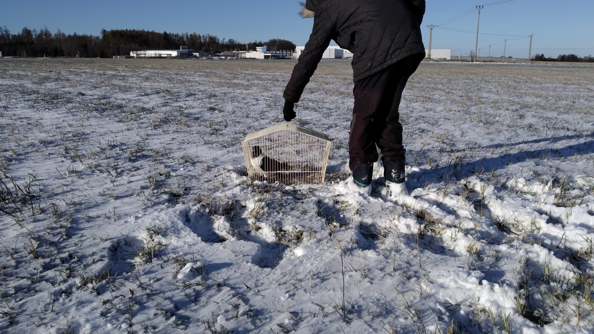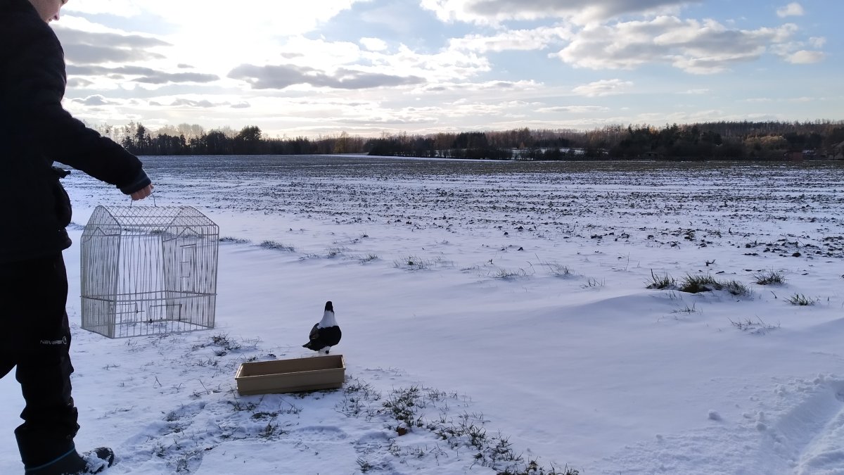 Dobrý večer, děkuji vám všem za užitečné postřehy k polaření. Udělali jste mi radost tím, že by to mohlo snad fungovat bez toho "courání se" po vsi a okolních střechách. Děkuji i za dobře míněnou radu nechat testování orientace až na jaro. Do jara je ale daleko a zvědavost veliká, tak jsem to dnes zkusil. Počasí nebylo úplně ideální, celkem foukalo a je poprašek sněhu, ale zase bylo krásně slunečno. Vybral jsem letošního holuba, ještě nespářeného. Je to potomek mého holuba a koupené holubice z voliérového chovu. Holuba jsem odvezl za ves na louku, 750m daleko od holubníku (vzdušnou čarou), a vypustil. Syn měřil doma čas do návratu. Měl jsem strach, aby to nevzal směrem k nedaleké průmyslové zóně (je vidět na fotce), ale nakonec to dobře dopadlo a za 1min a 15s byl doma na střeše. Jak hledal cestu, tak letěl trošku oklikou, ale letěl "přímo" domů, nikde neposedával, což mi udělalo velkou radost. Odpoledne jsem ho čapnul podruhé a odnesl na opačnou stranu než ráno. Toto pole je celkem blízko (450m vzdušnou čarou), navíc těsně u lesa, a tak jsem čekal, že se vydá směrem ke vsi. K mému překvapení zmizel nad lesem. Už jsem se sním pomalu loučil, ale za minutu se objevil a ještě nějakou chvíli kroužil nad polem a lesem, ale nakonec cestu našel. Trvalo mu to 3 minuty. Opět nikde neposedával a letěl "rovnou" domů. Celkem mě to potěšilo, ještě to není s dnešními MP tak špatné, a tak je na jaře asi zkusím naučit loukařit.
