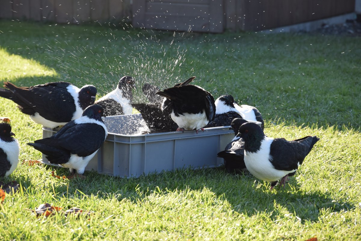Když jsem si holuby pořídil, tak za deště měli problém a některé jsem musel sebrat a hodit aspoň na střechu kolny, aby je něco nesežralo. Teď už tomu tak naštěstí není. Když je velký liják tak jsou zalezlí a maximálně slétnou se nazobat. Když je déšť mírný, tak vyletí na střechu a "sprchují se", zvedají křídla a očividně si to užívají. Ve vaničce se mně ale koupat nechtějí, vlezli tam snad jednou, tak jsem to už vzdal (asi se promočení na zemi necítí bezpečně).
