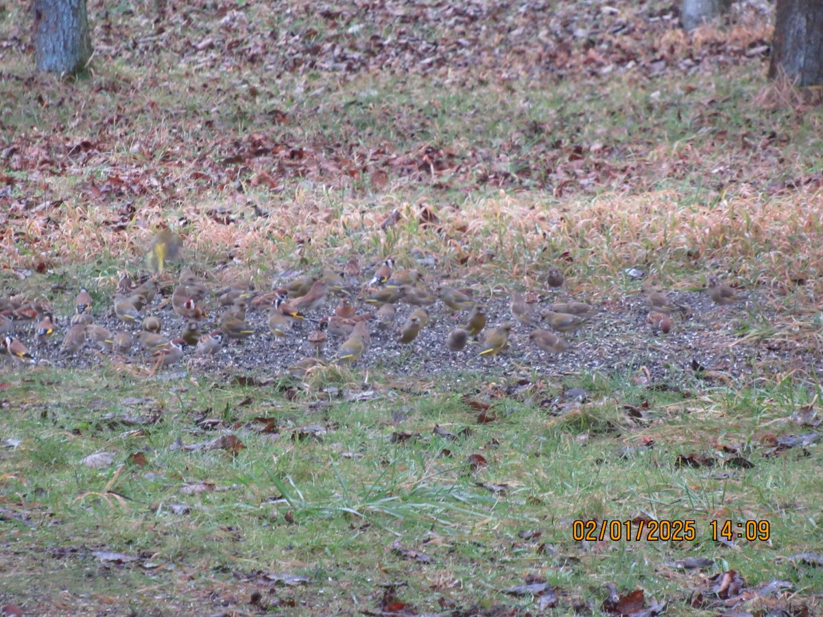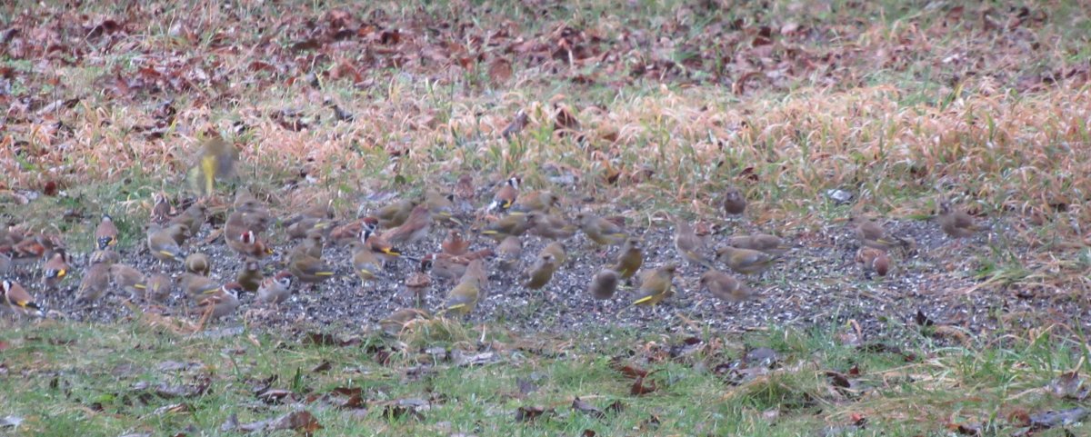 tak jsme schválně vyfotili část hejna, co létá k nám. Jsou to jen ti, kteří se nevešli do krmítek a sbírali ze země, tak jsem zvědavá, jestli to někdo dokáže sečíst, my doma všichni došli k jinému počtu.