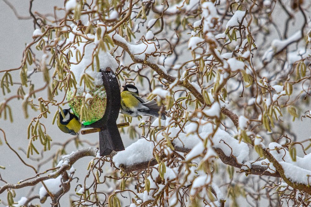 Krmím: slunečnice, směs zrní a semen, pšeničný šrot, oves.vločky, ořechy, jablka, lůj/sádlo, tukové koule.