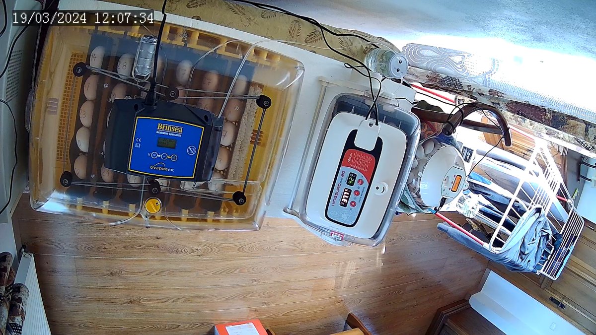 Loni se mi podělalo během líhnutí čerpadlo na tý kulatý 10Pro Rcomce, tam byla pohoda, nízká vlhkost půl dne nevadí, ona je udělaná na dolejvání vody ručně, takže ten zbytek líhnutí sem dojel růčofůčo.. Přesně po vylíhnutí prvních kuřat sem měl dlouhej výpadek proudu ve vsi a odchovnu sem nevytopil, tak sem využil dva dny kvokající slepici, naštěstí je přijala, sic po dvou dnech kvokání kulila voči, jak to de rychle 🙂 Výpadek proudu u líhní mám jištěnej 1kW UPSkou. Snažim se to mít všechno pojištěný, ale stejně to dokáže zaútočit z jiný strany, začně blbnou líheň 😈 Tak sem si to vokameroval, sleduju to kdyby něco, ale ono to příjde určitě zas vodjinud 🤪