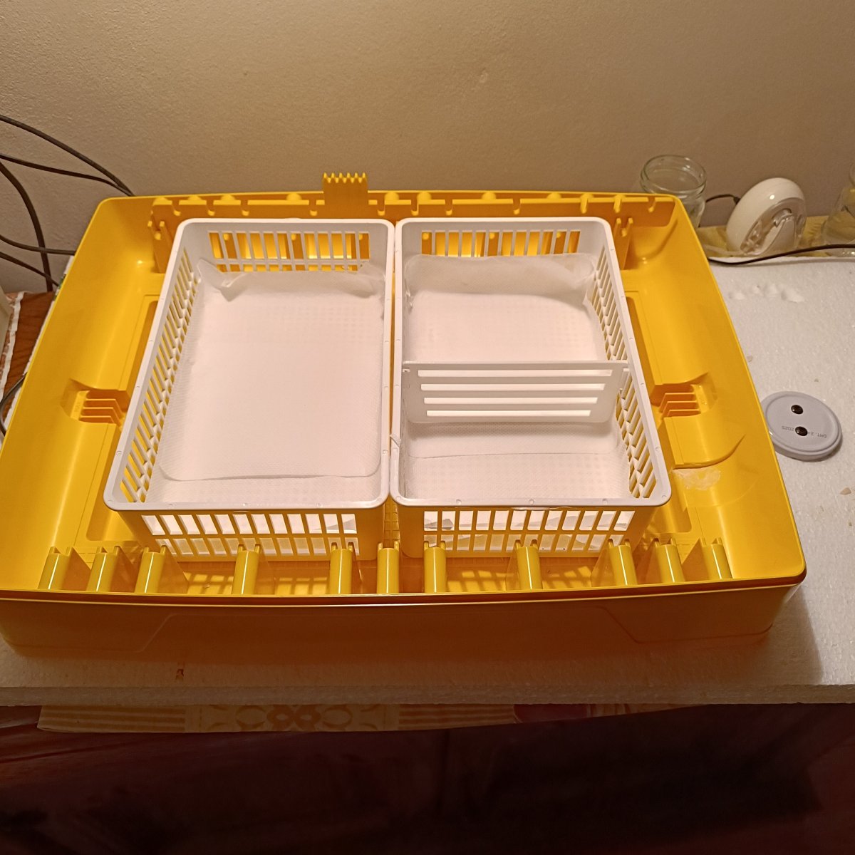 Brinsea Ovation 56ex.. Tak po prvním líhnutí nadšení.. Moje první dojmy už vůbec nesdílim.. Otáčení se nějak srovnalo, fakt netuším co bylo při tom prvotním zkoušení problémem, ale teď jelo po celou dobu líhnutí perfektně, žádný nadzvedávání, pěkně skončí v krajní poloze a pak zas na druhou stranu.. O teplotě nemusím ani mluvit, tu držela správně po celou dobu.. To dvojitý víko, který vede teplej vzduch podle mě značka ideál.. Vlhkost po dobu líhnutí držela jak sem nastavil, v mejch podmínkách jsem pak v dolíhni dosáhnul max72%(je lepší dát ten nasákavej materiál jakoby nastojato, ne naležato), víc už nedala, při prvních kuřatech to vylezo nad 80%, pak po prvním odebírání vylíhlejch kuřat sem nalil do druhý “nevyužitý” vaničky teplou vodu a dal tam jednu kuchyňskou houbičku a vlhkost se pohybovala okolo 80% i při průběžným vyndavání kuřat.. Ad čištění, pořídil sem si od Cimuky košíky, krásně tam dva padnou, vystlal je papírovejma utěrkama, vytisknul na 3D tiskárně oddělovací přepážky, sice se zmenší kapacita ale to čištění pak probíhalo stylem vyjmout a vyhodit utěrky a košíky by se nemusely ani mejt(na obrázku dole je po vylíhnutí všech kuřat, s jen narychlo vyměněnejma utěrkama a je jak nová - dával sem do ní pak při 37°C doschnout vybraný kuřata z druhýho líhnutí v Rcomce) V líhni asi 10 malejch úlomků skořápek, taky jen vyfouknout a čištění je hotovo.. Víko mělo uvnitř chmíří, ale nebylo to zas tak strašný, ani sem ho nerozdělával, jen vyfoukal kompresorem.. Rozdělání bych viděl až tak po 3-4 líhnutí.. Jediný co chtělo používat destilku, hadička je na výměnu a ten svod ve víku je dost zadělanej od vodního kamene.. Za mě teda obrovská spokojenost 👍